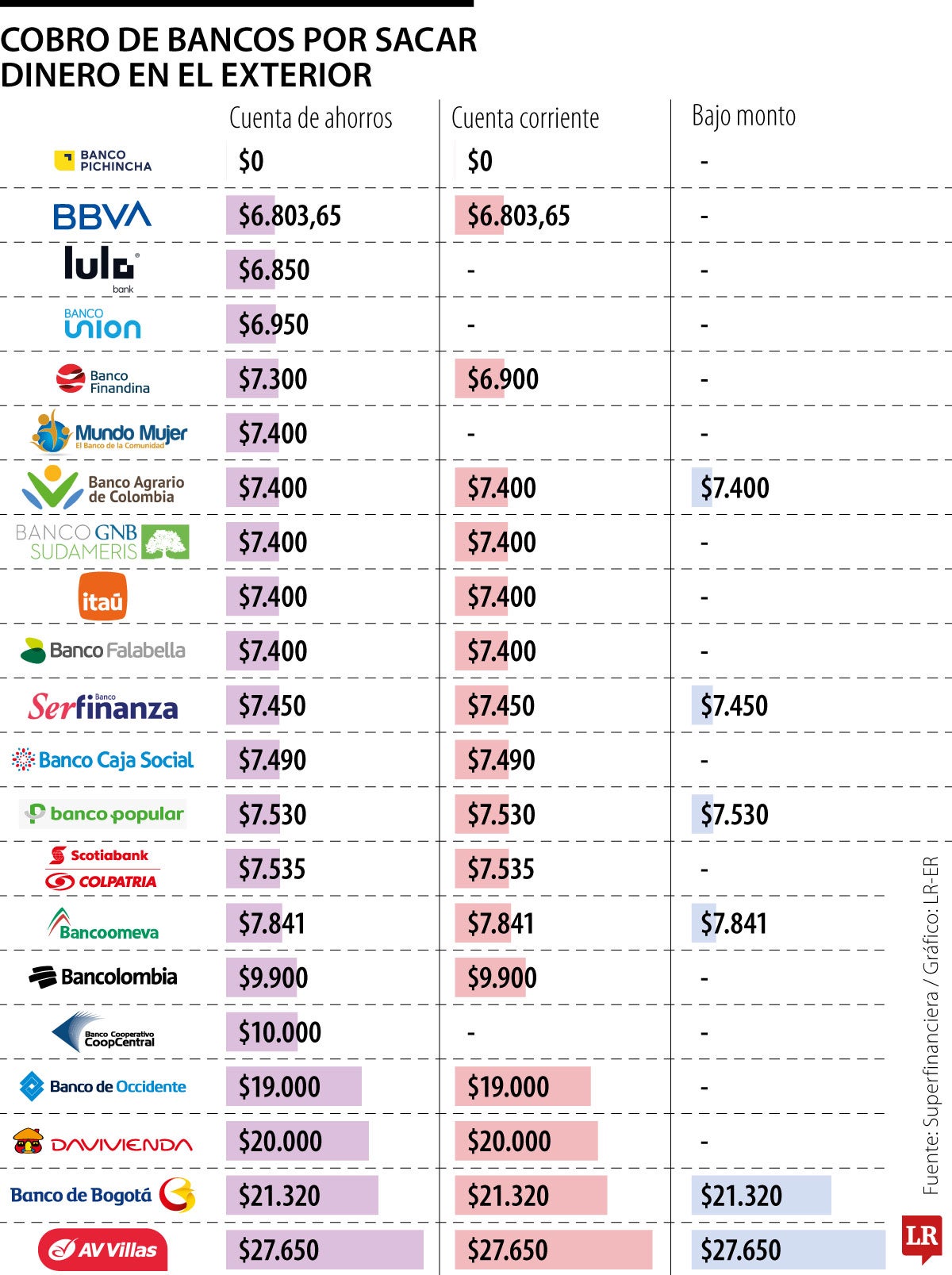 Con corte al 1 de julio, y con datos recopilados de la Superintendencia Financiera, sin contar al Banco Pichincha, que no genera cobro para clientes, el banco español Bbva lidera dentro del ranking, ya que para hacer retiros en el exterior la entidad solo cobra $6.803,65, US$1,69, para sus cuentas de ahorro.