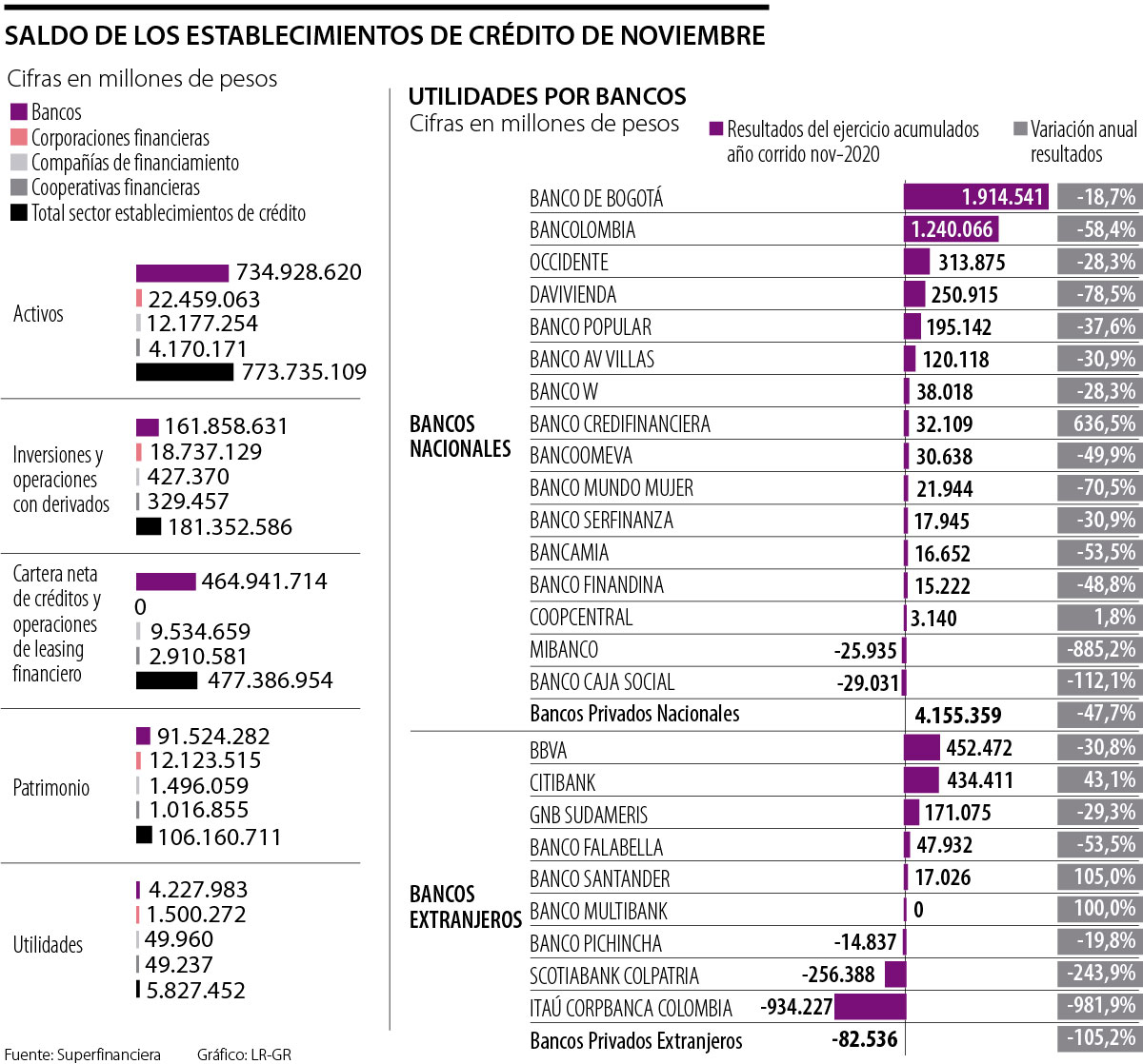 Hay que recordar que los establecimientos de crédito alcanzaron resultados acumulados por $5,8 billones, cifra inferior en 51% frente a 2019, según lo reveló el informe del sistema financiero al cierre de noviembre de 2020 emitido por la Superfinanciera.