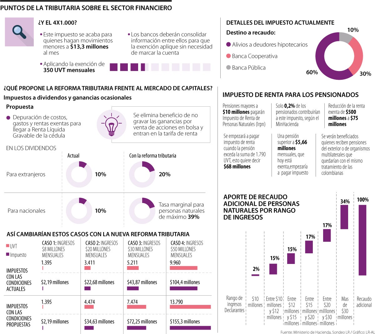 Otro punto que se incluye en la tributaria se refiere al impuesto a las movimientos financieros. Según lo explicó el director de la Dian, Luis Carlos Reyes, dicho gravamen se acabaría para quienes hagan movimientos de menos de $13,3 millones al mes, lo que corresponde a 350 UVT.