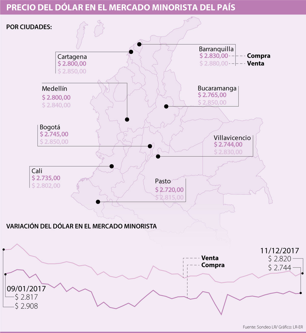 A dos semanas de finalizar 2017, mucha gente está alistando todo para las esperadas vacaciones de fin de año. Si usted tiene planeado salir del país, tenga en cuenta que para buena parte de los destinos necesita llevar dólares, por lo que LR hizo un sondeo en las principales ciudades del país para conocer en dónde se consigue más cara la moneda y cuánto ha variado en las últimas dos semanas.