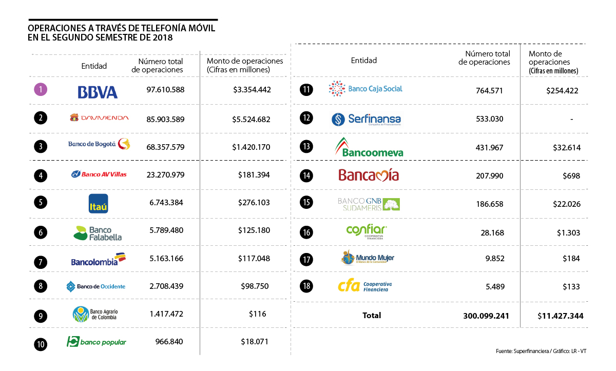 En tercera posición se ubicó el Banco de Bogotá, con 68,36 millones de operaciones a través de telefonía móvil. Las monetarias llegaron a 3,28 millones y movieron $1,42 billones.
