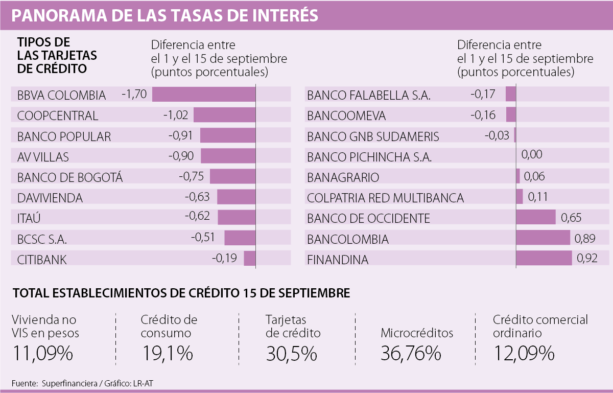 El último reporte de tasas y desembolsos de la Superintendencia Financiera, correspondiente a la semana que terminó el 15 de septiembre, se ve que en las tarjetas de crédito de los bancos la caída en las tasas promedio de interés ha sido de 43 puntos básicos (pb), mientras que en el promedio de los plásticos de todos los establecimientos de crédito, la reducción ha sido de solo 6 pb.
