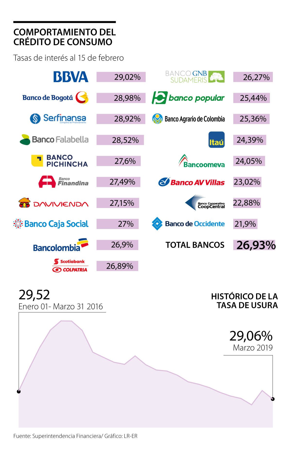 Los bancos que tienen su cobro de interés mensual más cercano al nuevo límite son Bbva Colombia, con 29,02%; Banco de Bogotá, con 28,98%, el recién creado Banco Serfinansa, con 28,92%; seguido de Banco Falabella, con 28,52%, y Banco Pichincha, con 27,6% (ver gráfico).