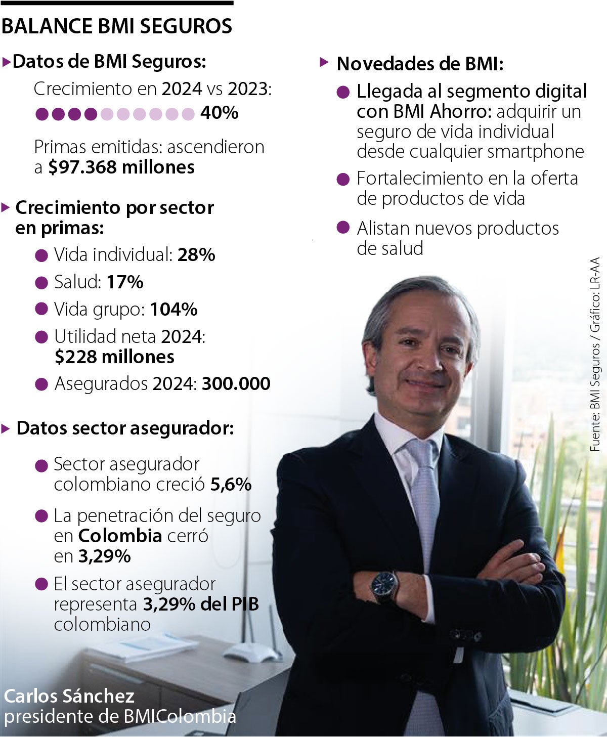 El presidente de BMI Colombia, entidad que pertenece a BMI Financial Group, dijo que cerraron el año pasado con 300.000 asegurados en todas sus ramas, en especial en los segmentos de vida y salud, que son el foco de la empresa.