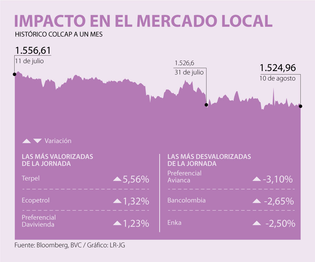 A estas bajas se unieron los mercados emergentes, como el de Brasil y México que se vieron altamente impactados. Mientras que la bolsa colombiana vio una caída calificada por los analistas consultados como “leve”, al cerrar con una variación negativa de 0,47% en su principal índice, el Colcap.