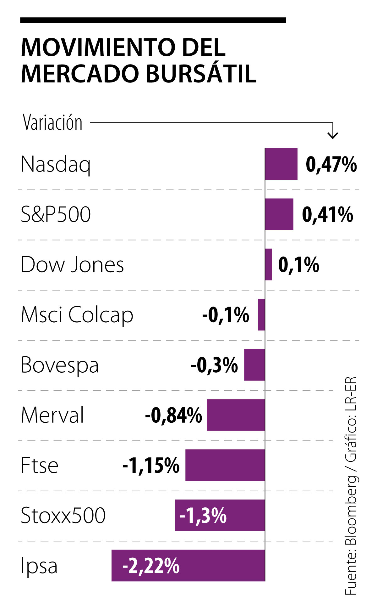 En América Latina, el Bovespa de Brasil perdió poco más de 0,30%, el Ipsa de Chile cayó 2,22%, el Merval cedió 0,84% y el Msci Colcap de Colombia retrocedió 0,10%.