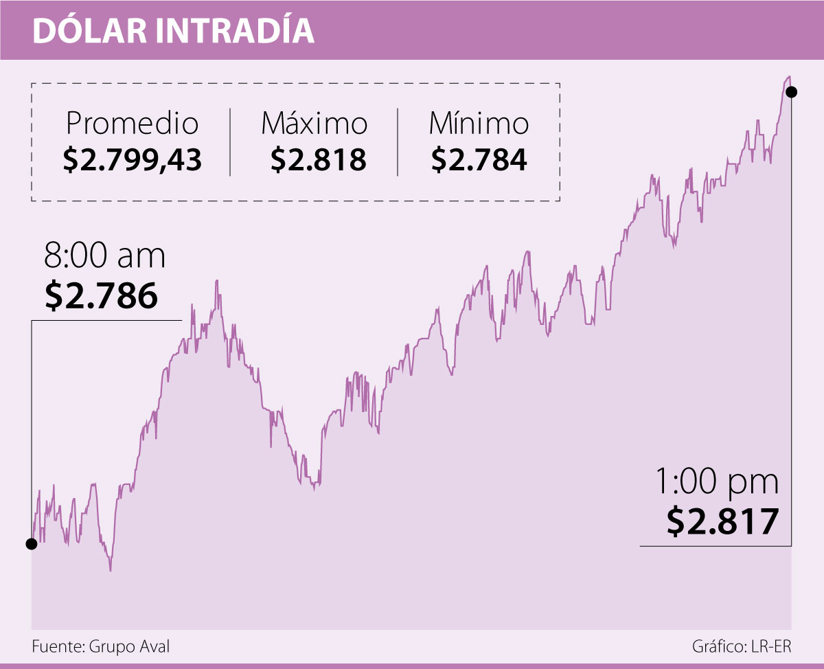 Tras varias semanas estando por debajo de la barrera de los $2.800, ayer el dólar tuvo un precio promedio de $2.799,14, lo que significó un alza de $41,14 frente a la Tasa Representativa del Mercado (TRM), que se ubicó en $2.757,96.
