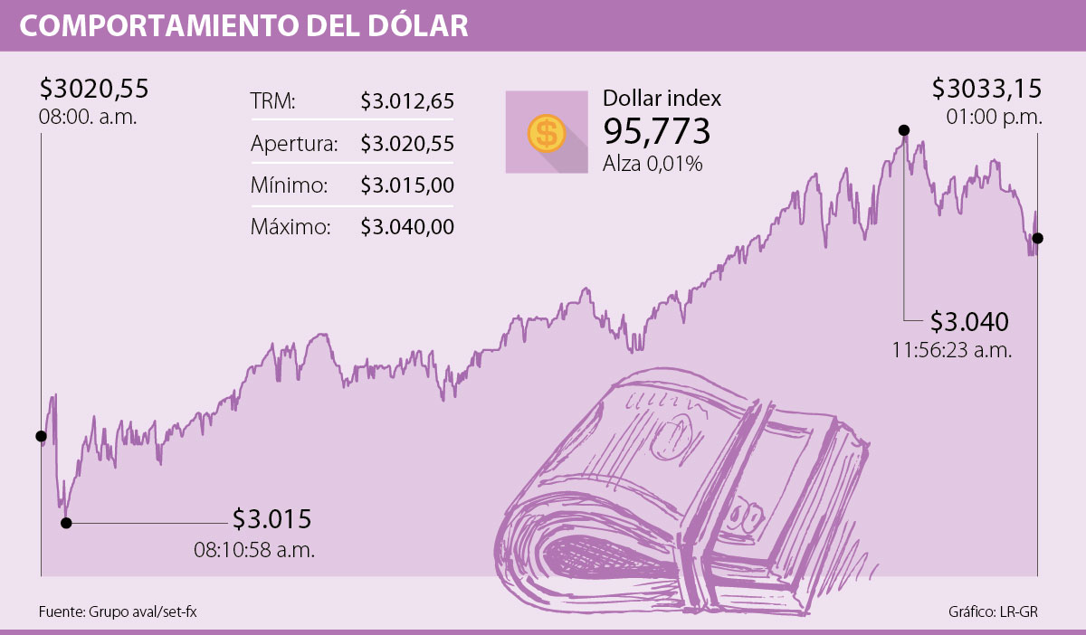 Con este panorama, el dólar en el mercado local también cerró con nuevas alzas y y se cotizó en un precio promedio de $3.028,18, lo que significó un alza de $15,53 frente a la TRM del día que se ubica en $3.012,65. Al principio de la jornada, cuando el dólar se cotizó en precio cercanos a los $3.015 el peso se mantuvo fuerte apoyado en el valor del barril de petróleo, que seguía en valores cercanos a US$86. Sin embargo, a mitad de la sesión, las dos referencias de crudo cayeron desde máximos de cuatro años 1,98% a US$84,58 el barril de Brent y 2,72% a US$74,33 el WTI. Así, el peso perdió su fortaleza y alcanzó hasta un precio máximo de $3.040.