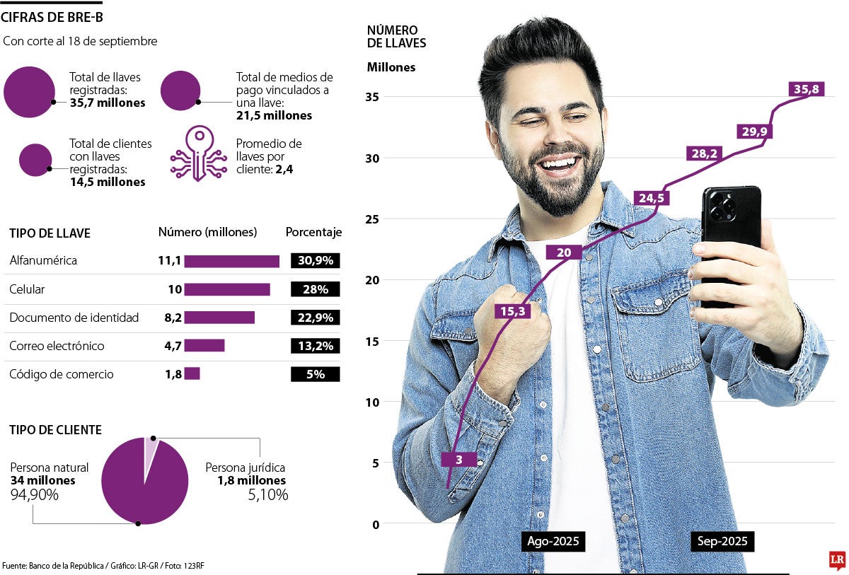 La forma de pagar y transferir dinero cambió cuando entró en funcionamiento Bre-B el pasado julio. Cifras del Banco de la República indican que desde mediados de ese mes hasta el 18 de septiembre se han registrado un total de 35,7 millones de llaves. Asimismo, los números del Emisor indican que hay hasta 14,5 millones de registros de personas en el sistema de pagos interoperables. Es importante tener en cuenta que la inscripción de llaves que inició en julio no fue una apertura total del sistema de pagos, sino un primer acercamiento a las llaves.