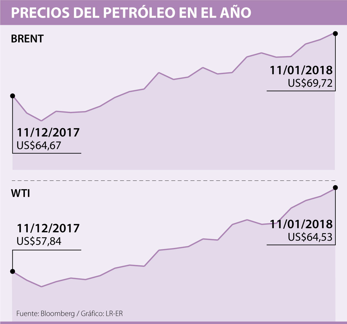 En lo corrido del año, el petróleo Brent ha ganado cerca de US$3, pues arrancó 2018 en niveles de US$66,57 y, en opinión de Orlando Santiago, gerente de Fénix Valor, la tendencia se va a mantener, al menos, en la primera parte del año, pues el mercado está llegando a un punto de equilibrio sobre los US$70 por barril.