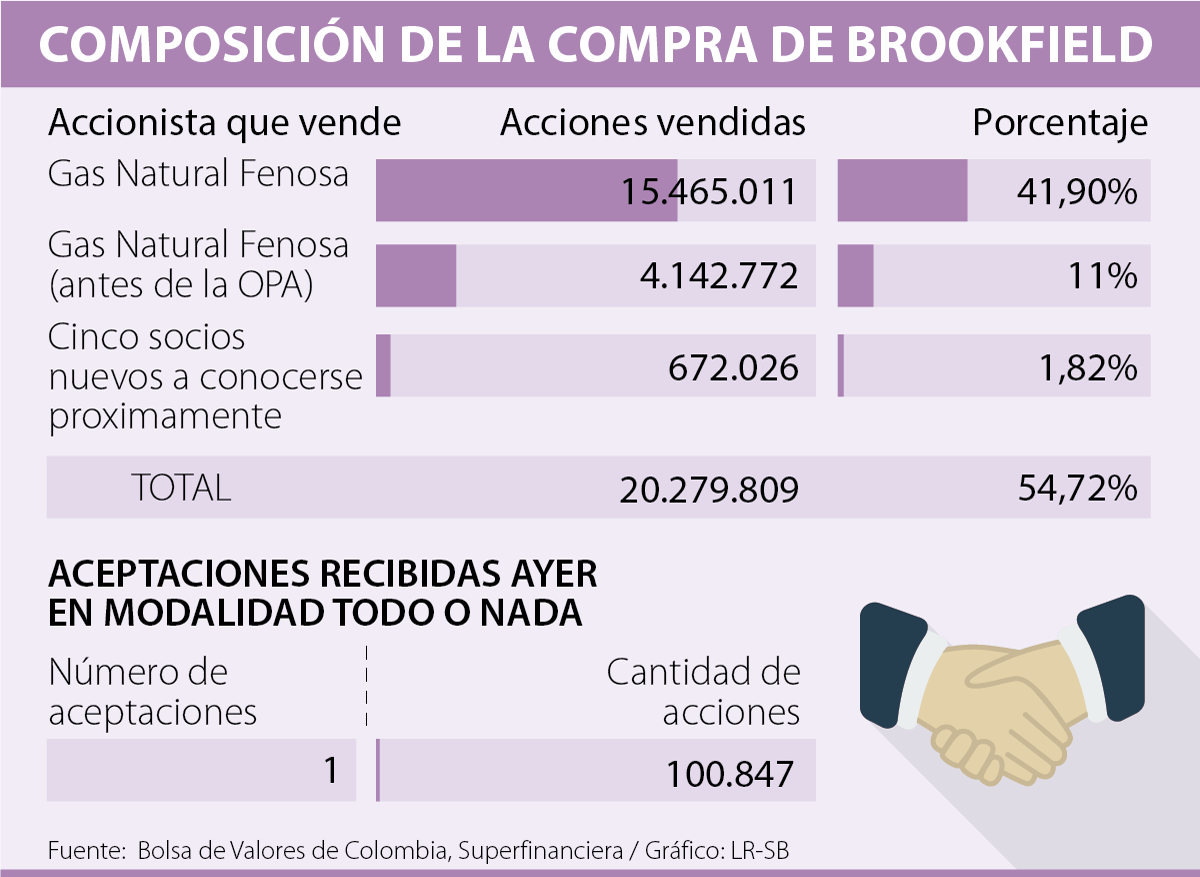 De acuerdo con el boletín de información de las aceptaciones recibidas el 28 de mayo, emitido por la Bolsa de Valores de Colombia, cinco nuevos socios decidieron vender un total de 672.026 acciones durante la jornada, es decir 1,82% más del total de la compañía que pasa a ser parte de Brookfield, sumándose a 41,89% que pertenecía a la española Gas Natural Fenosa S.A., y que vendió saliendo así de la totalidad de sus inversiones en el país.