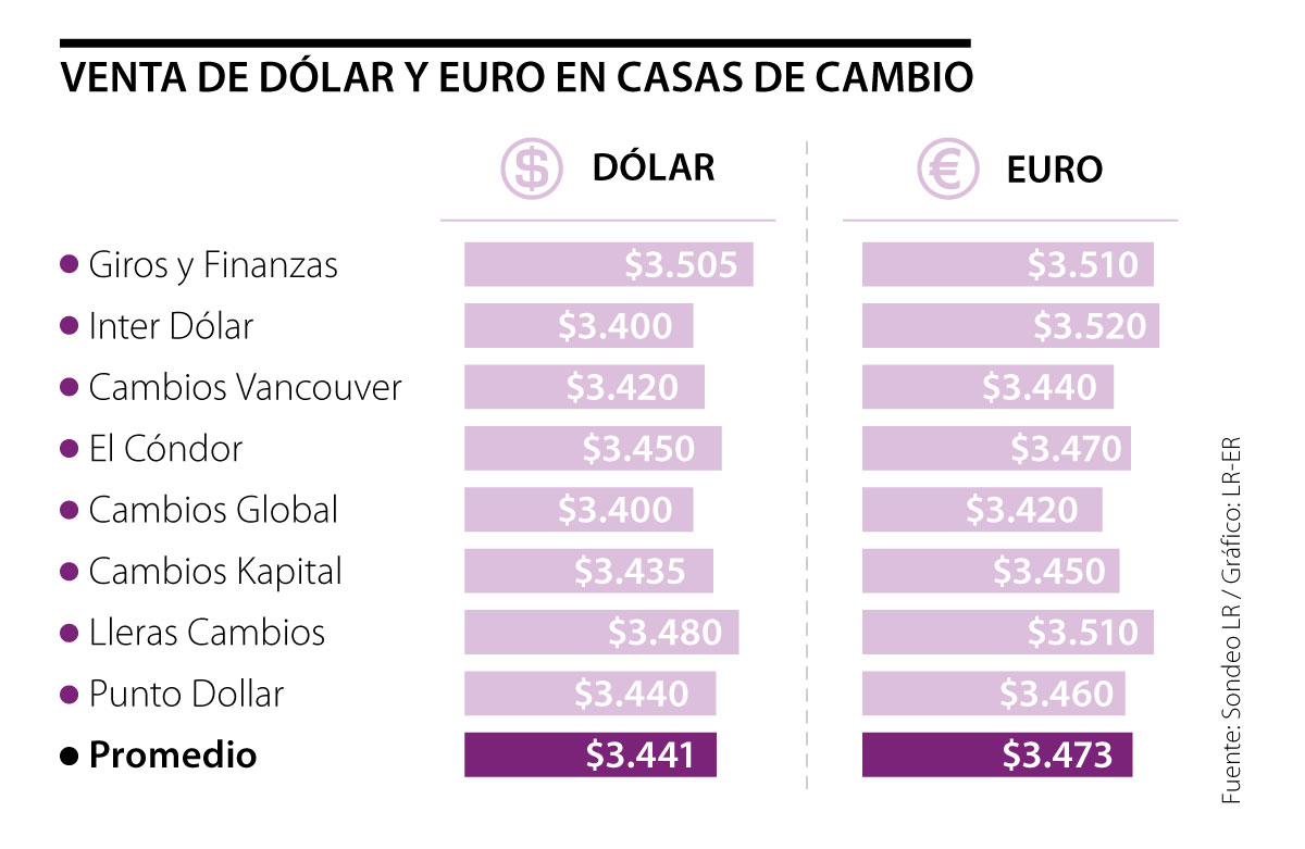 Según un sondeo realizado por LR, durante esta semana, los principales profesionales del cambio del país venderán el euro a $3.473 en promedio. Entre tanto, las casas de cambio comercializarán el dólar a $3.441 en promedio, es decir, $328 más barato que la Tasa Representativa del Mercado, que hoy rige en $3.769,67. La mejor oferta la ofrecen Inter Dólar y Cambios Global, ambas con $3.400 por unidad.