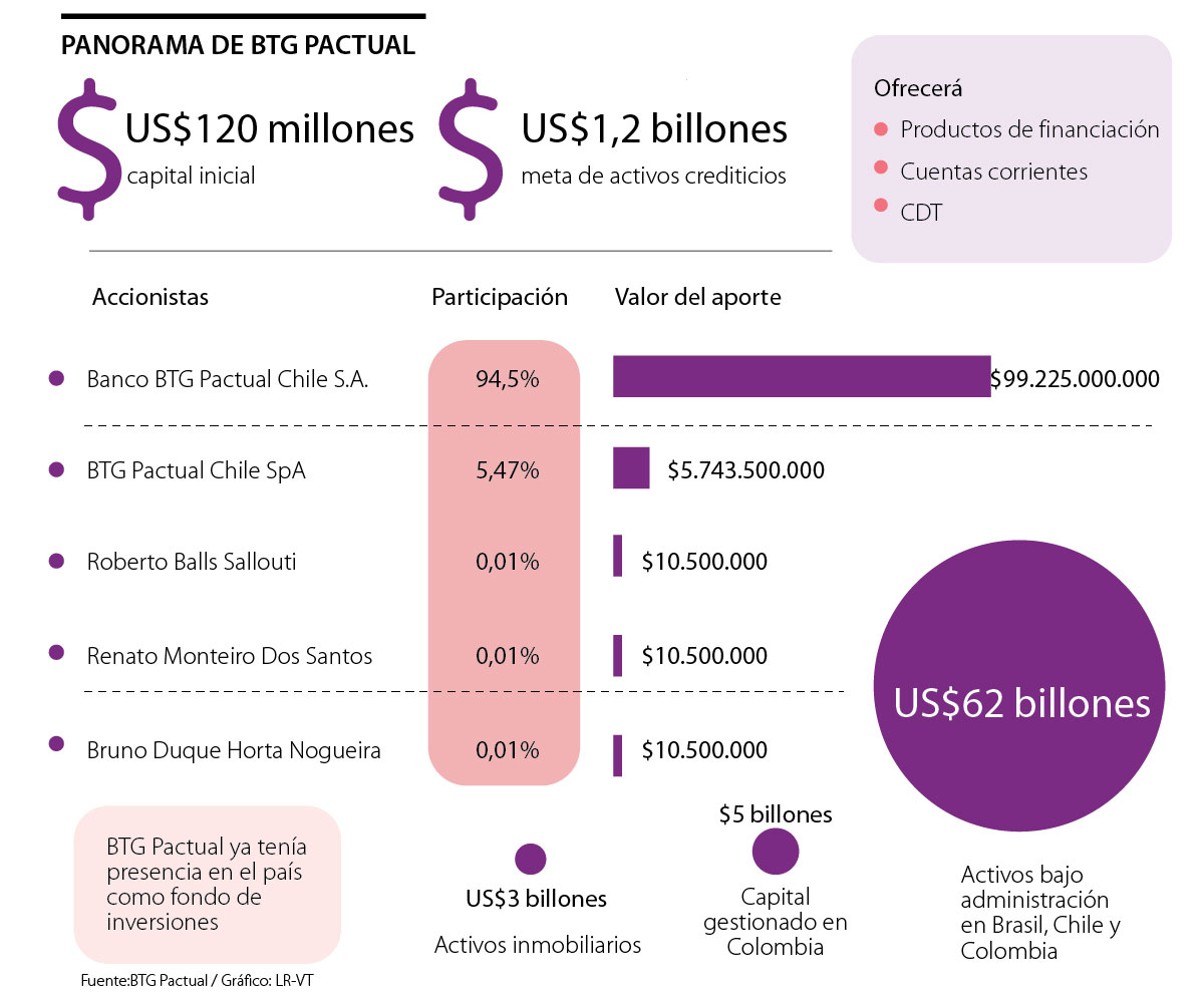 Tras varios meses de espera y luego de que la Superintendencia Financiera de Colombia (SFC) autorizó la constitución de BTG Pactual como banco en Colombia, este entrará a operar con un capital de US$120 millones. La compañía ofrecerá productos de financiación, cuentas corrientes y CDT, con lo cual espera llegar a US$1,2 billones de activos crediticios durante los próximos dos años.