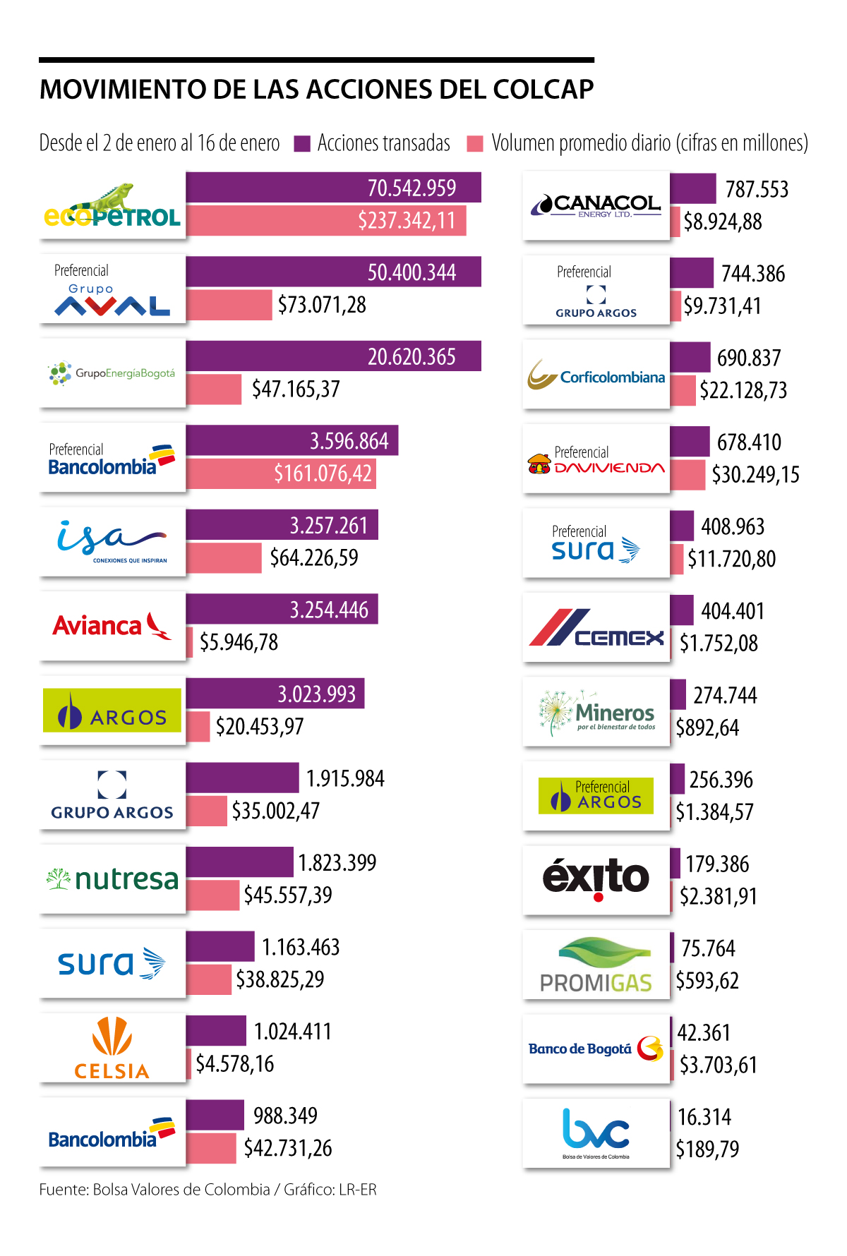En las dos primeras semanas de enero, de las acciones que hacen parte del índice Colcap, que refleja las variaciones en los precios de los 24 títulos más líquidos de la plaza bursátil, las especies que movieron menor cantidad de acciones negociadas en este periodo fueron la de la Bolsa de Valores de Colombia (16.314), la del Banco de Bogotá (42.631) y la de Promigas (75.764).