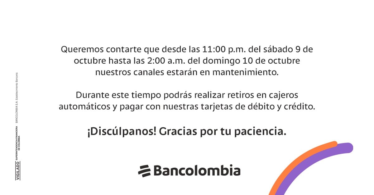 Bancolombia anunció a través de sus redes sociales que sus canales estarán en mantenimiento desde las 11:00 p.m. del sábado 9 de octubre, hasta las 2:00 a.m. del domingo 10 de octubre.
