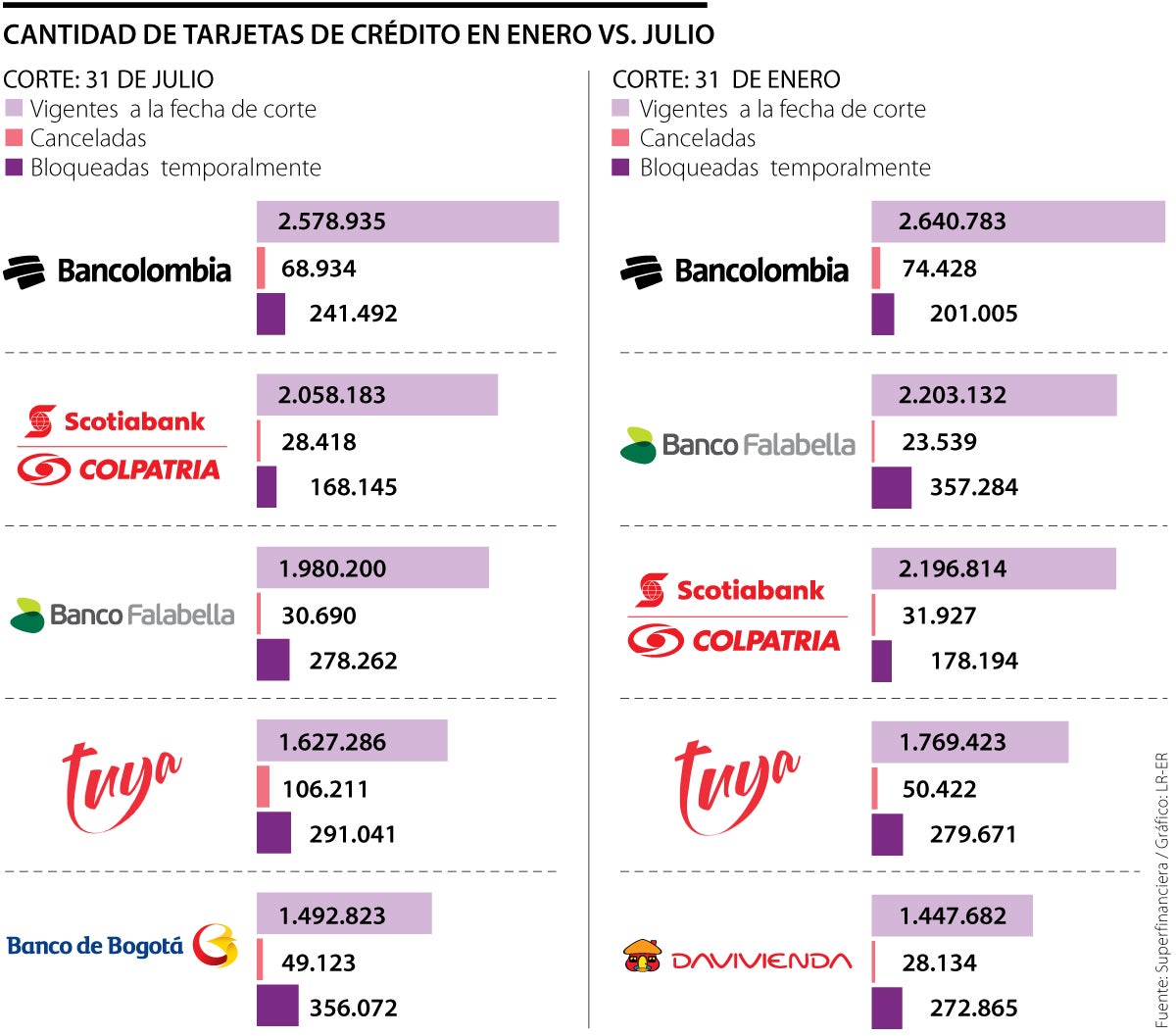 Bancolombia, para finales de enero, contaba con 2,6 millones de tarjetas vigentes, y para julio perdió 61.848, quedando en 2,5 millones de tarjetas de crédito registradas. A su vez, bloqueó 40.487 tarjetas temporalmente.