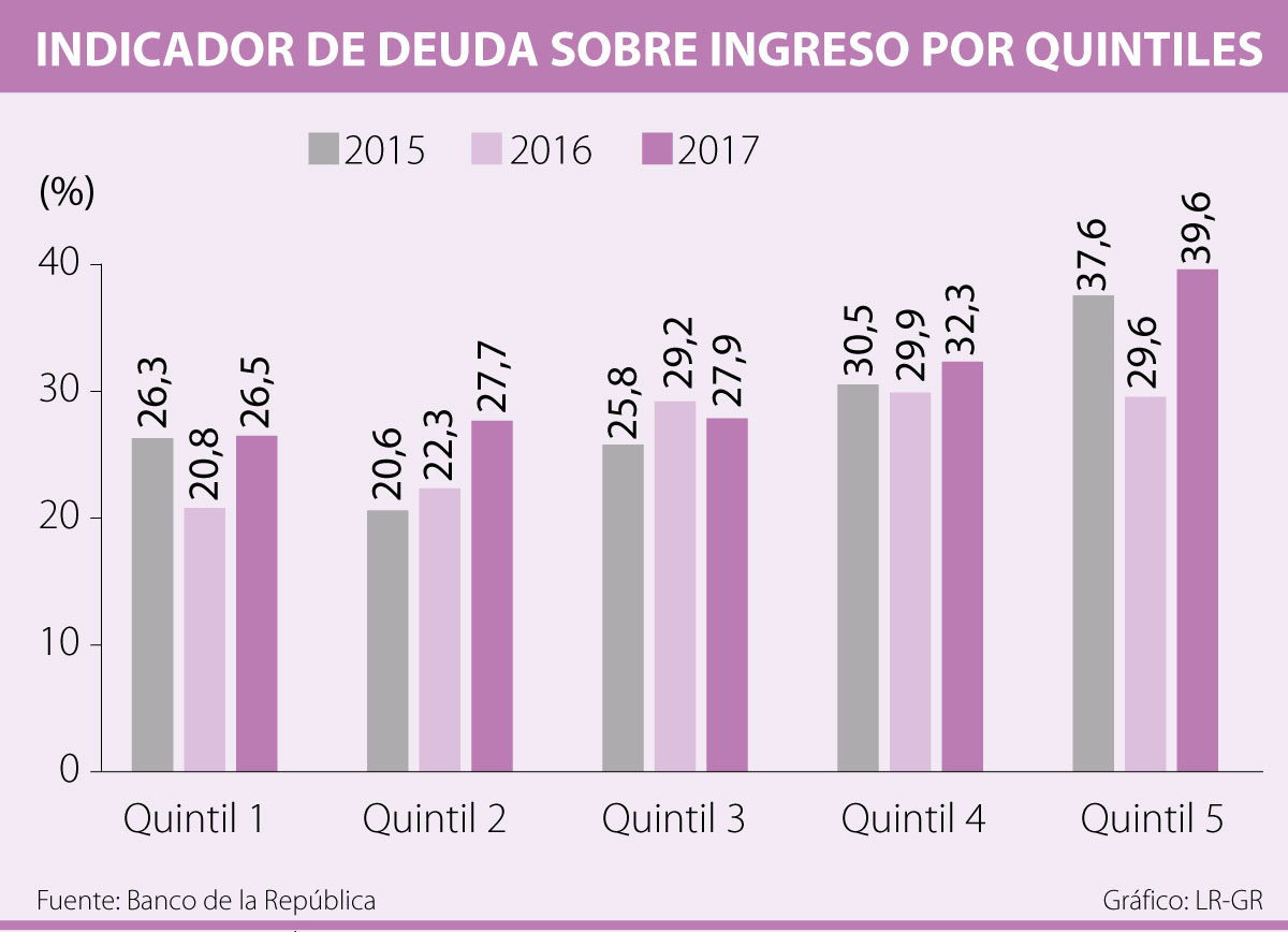 Entre 2016 y 2017 el indicador de carga financiera (CFI) para Bogotá aumentó, pasó de 15,1% a 18,4%, luego de haber registrado una disminución en 2016. Según explicó en un comunicado el Banco Central “este comportamiento respondió principalmente al menor crecimiento que viene presentando el ingreso dado el entorno macroeconómico actual, y a un aumento en la cuota de los créditos que tienen estos agentes”.