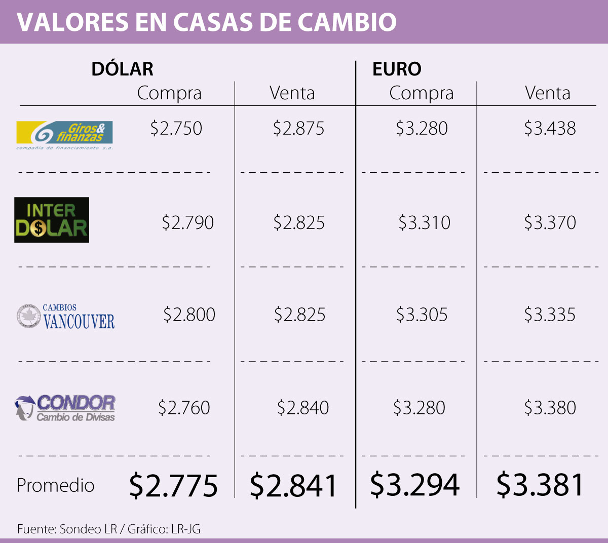 Si su objetivo por otro lado es viajar al viejo continente, debe tener en cuenta que el precio promedio de venta del euro está en $3.381, siendo Cambios Vancouver la que lo ofrece a menor precio; seguido por Inter Dólar, con $3.370; El Cóndor, con $3.380, y el valor más alto de venta es el de Giros & Finanzas con un valor de venta de $3.438. Según los analistas, los eventos de esta semana generarán volatilidad en su precio.