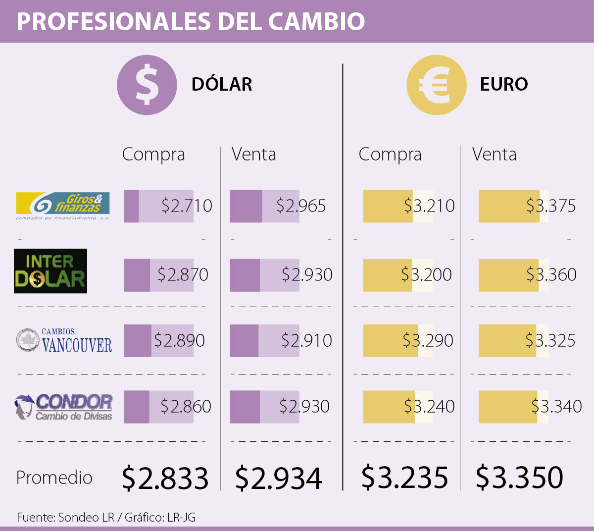 En caso de compra de la moneda comunitaria, por esta darán en promedio $3.235. La firma que estará pagando más por la moneda será, de nuevo, Cambios Vancouver, cambiando cada unidad de la divisa por $3.290, es decir, $55 por arriba del promedio el mercado.