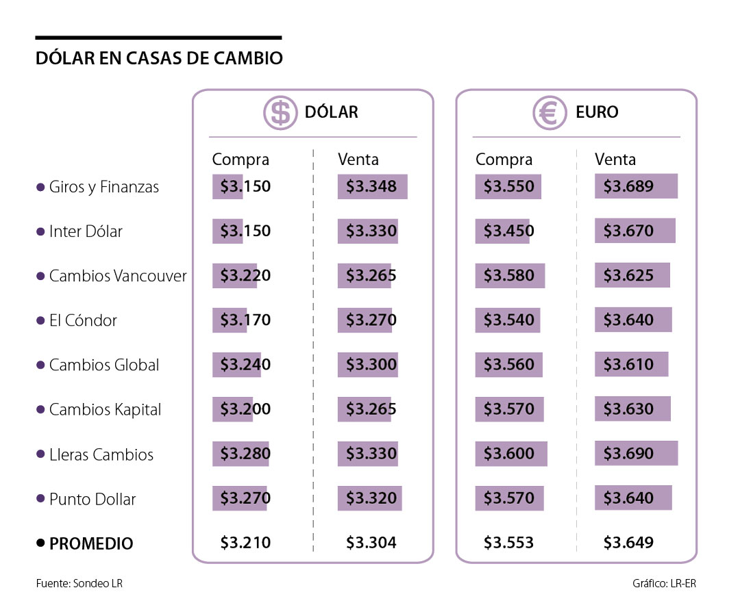 Para comprar dólares más baratos, en Cambios Vancouver y Cambios Kapital la venta de la divisa está en $3.265, y le sigue la empresa El Cóndor, con un precio de $3.270.