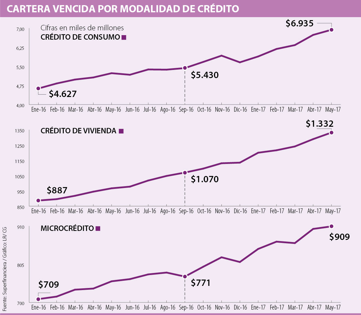 En mayo, la cartera vencida en créditos de consumo subió 27%, 24,5% en los de vivienda y 19% en los de microcréditos; estos datos los tuvo en cuenta un estudio hecho por Solvencia Colombia en el que encontró que sobre 2.500 personas que buscaban la figura para evitar las sanciones de los bancos, curiosamente 70% eran clientes con ingresos superiores a $4 millones mensuales.