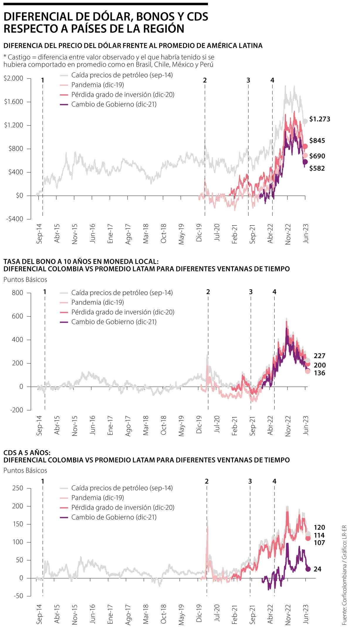 Los investigadores Julio Romero, Diego Gómez y Felipe Espitia, encontraron que los activos colombianos empezaron a estar castigados frente a la región desde mediados de 2022, "atribuible a los temores por el manejo económico del nuevo Gobierno, lo cual generó un castigo a Colombia frente a la región muy superior al que se observó, por ejemplo, como consecuencia de la pérdida del grado de inversión en 2021".