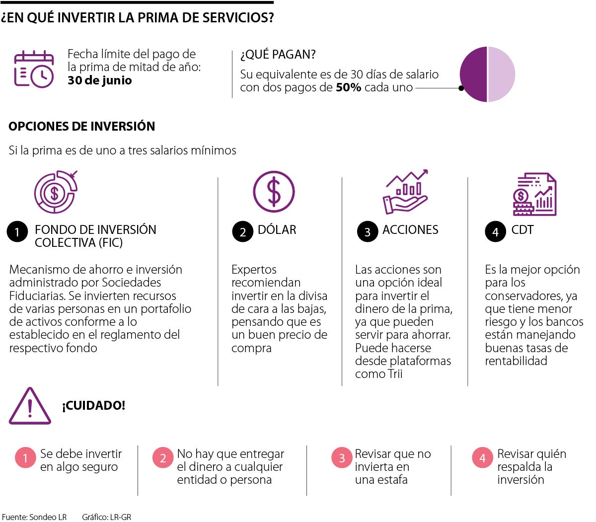 Si bien, invertir puede ser una idea muy llamativa pensando en “poner a producir el dinero”, es de mucho cuidado, pues no hay que caer en inversiones fraudulentas, o piramidales que le hagan perder la prima de servicios. “Debe ser algo seguro. No hay que entregar la plata a cualquiera. Ahora hay muchas modalidades de estafa, entonces hay que ser muy cuidadosos en la selección de lo que se quiere comprar y quién está respaldando la operación”, recomendó Juan Pablo Vieira, CEO de Tactical Trading. En línea con esto, vale la pena recurrir a páginas y entidades certificadas para no perder el dinero.