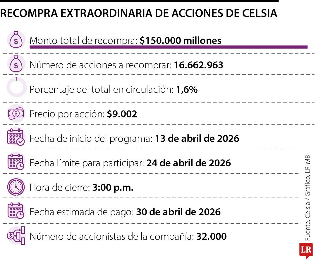 La compañía asegura que el periodo de aceptaciones, que inició el pasado 13 de abril, finalizará este viernes 24 de abril a las 3:00 p.m. "Permite que cualquier accionista, sin importar el tamaño de su participación, pueda monetizar parte de su inversión a un precio competitivo y transparente", dijo Celsia. El precio de cada acción recomprada llega a $9.002.