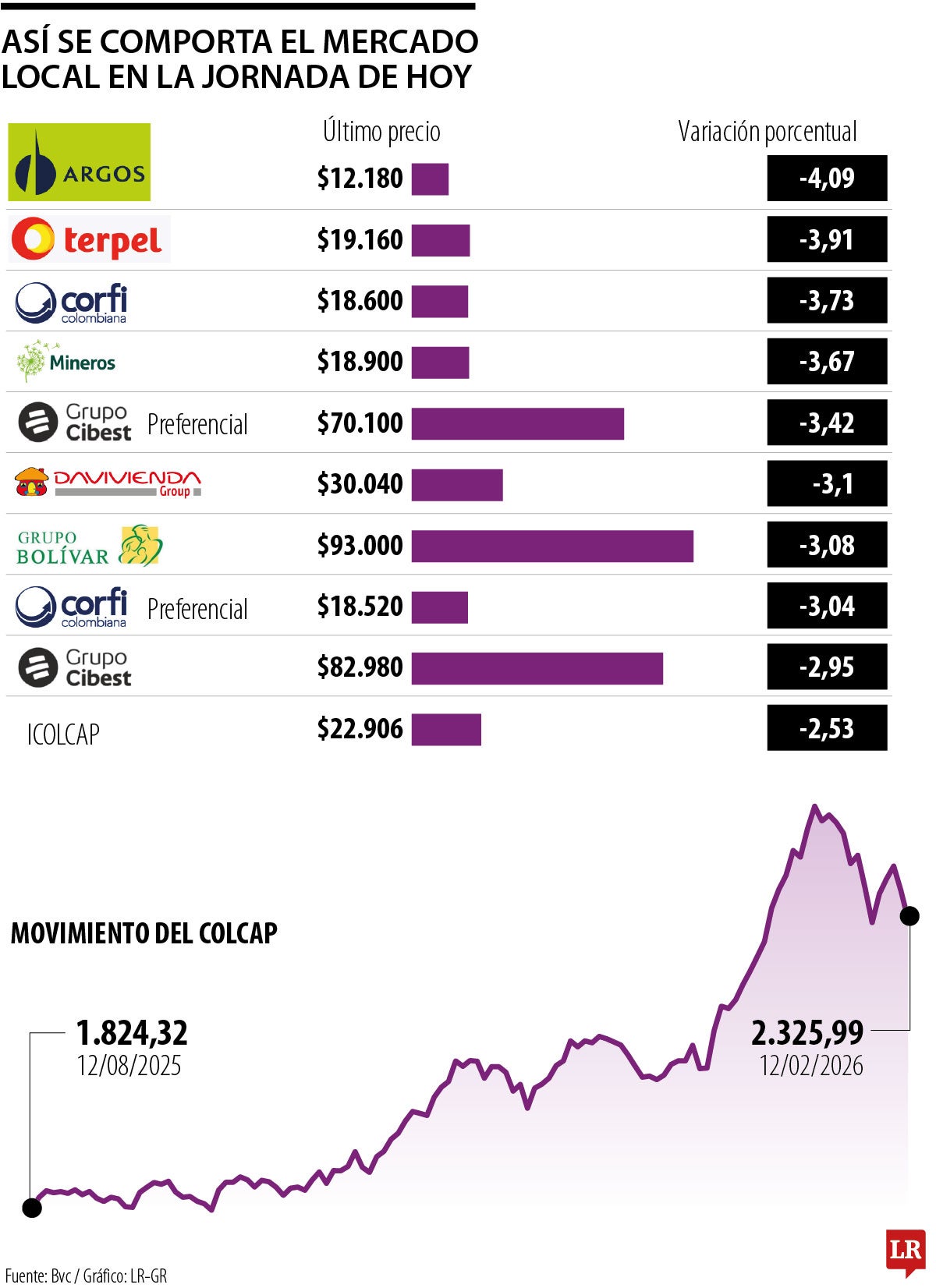 Entre las mayores desvalorizaciones se ubicó Cemargos, que se cotiza en $12.180 con una caída de 4,09%, seguido de Terpel con una baja de 3,91% y un precio de $19.160. También registraron descensos relevantes Corficolcf (-3,73%), Mineros (-3,67%), PfCibest (-3,42%) y PfDavivienda (-3,1%), evidenciando un retroceso marcado en distintos sectores del mercado.