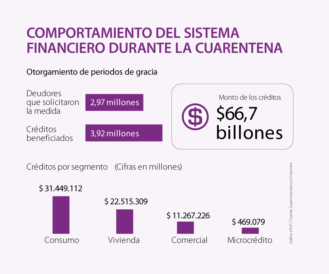La Superintendencia Financiera detalló que los resultados de los periodos de gracia del sistema acumulados desde el pasado 18 de marzo hasta al 3 de abril han beneficiado a 2,97 millones de deudores (personas naturales y jurídicas) con 3,92 millones de créditos por un saldo de cartera de $66,7 billones.