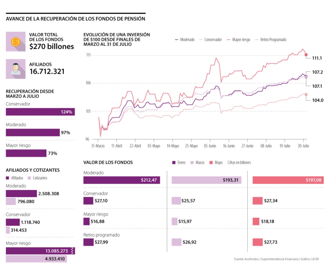 Por ejemplo, desde la última semana de marzo y al 31 de julio, las personas que están próximas a pensionarse, a quienes los fondos privados les clasifican sus recursos en el portafolio conservador para tener menores riesgos de volatilidad, son las mayores beneficiadas porque han registrado una recuperación de 124%, es decir, el fondo se recuperó totalmente y, solo por concepto de rendimientos, ya supera el valor que tenía en febrero.