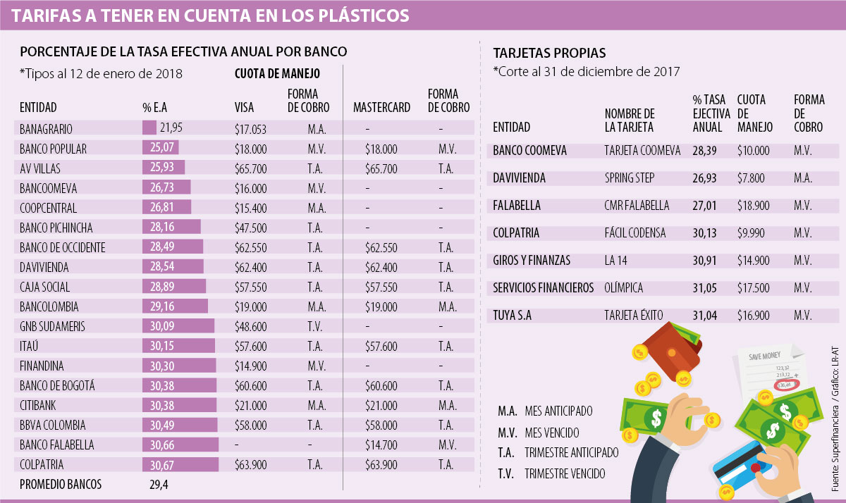Al corte del 12 de enero, según los reportes de todos los bancos las tasas más bajas estaban en el Banco Agrario, con 21,95%; Banco Popular, con 25,07%; y Av Villas, con 25,93%.