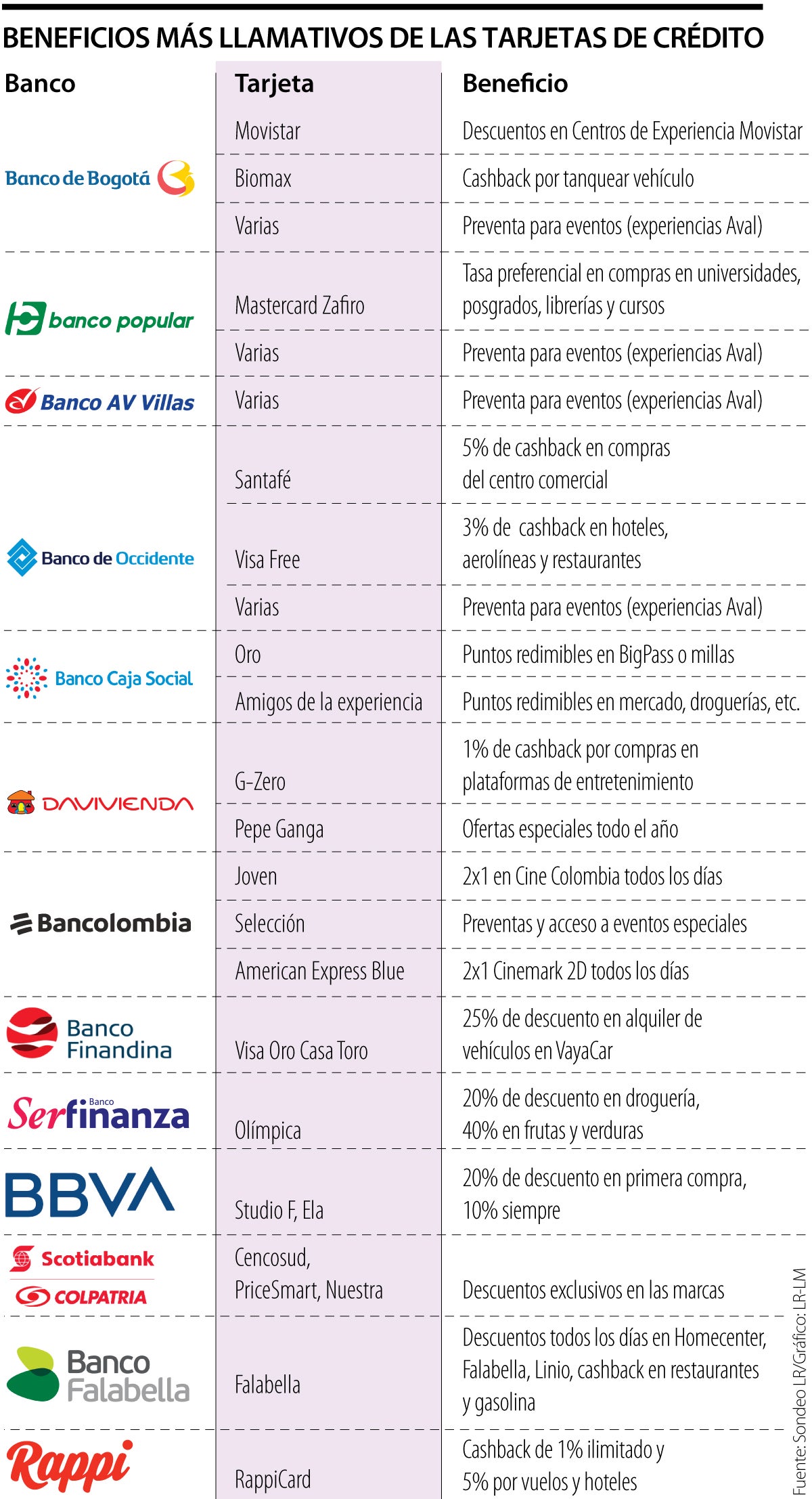 Davivienda ofrece algunas, como la tarjeta Pepe Ganga, con la que se tienen descuentos exclusivos durante todo el año; Scotiabank con tarjetas Cencosud y PriceSmart; o Serfinanzas con su tarjeta Olímpica, con la que se tiene 40% de descuento todos los miércoles en frutas y verduras y los jueves, 20% de descuento en droguería la economía.