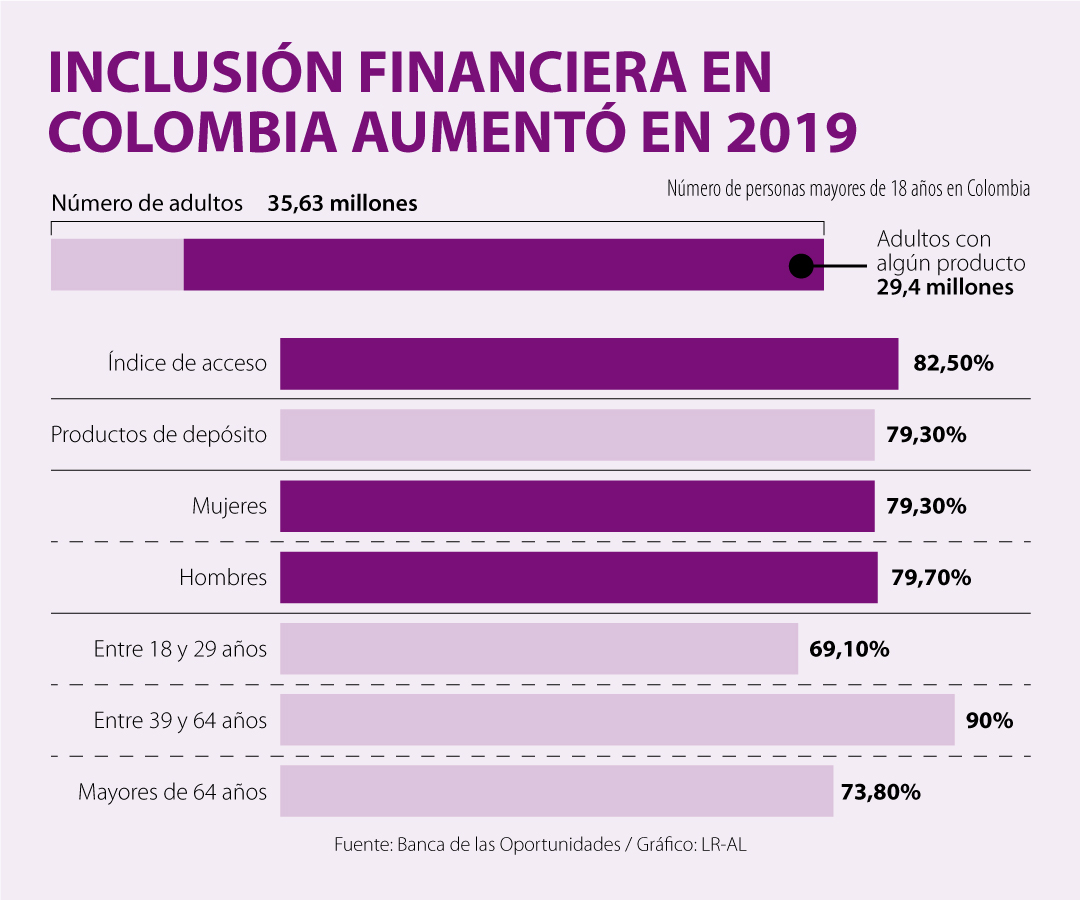 La Superintendencia Financiera y Banca de las Oportunidades presentaron el noveno Reporte de Inclusión Financiera (RIF) de 2019, que concluyó que la oferta de productos y servicios financieros continuó en aumento y, al cierre del año pasado, el Indicador de Acceso se ubicó en 82,5%, lo que equivale a 29,4 millones de adultos con, al menos, un producto de ahorro o de crédito.