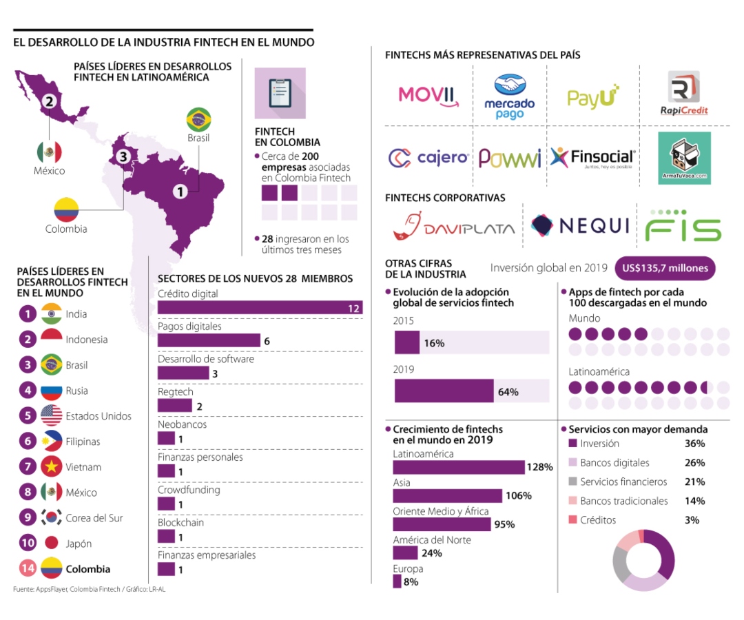 Estas 28 empresas financieras tecnológicas son, principalmente, de los subsectores de créditos y pagos digitales, pero se resalta la presencia de ocho de los nueve segmentos del ecosistema.