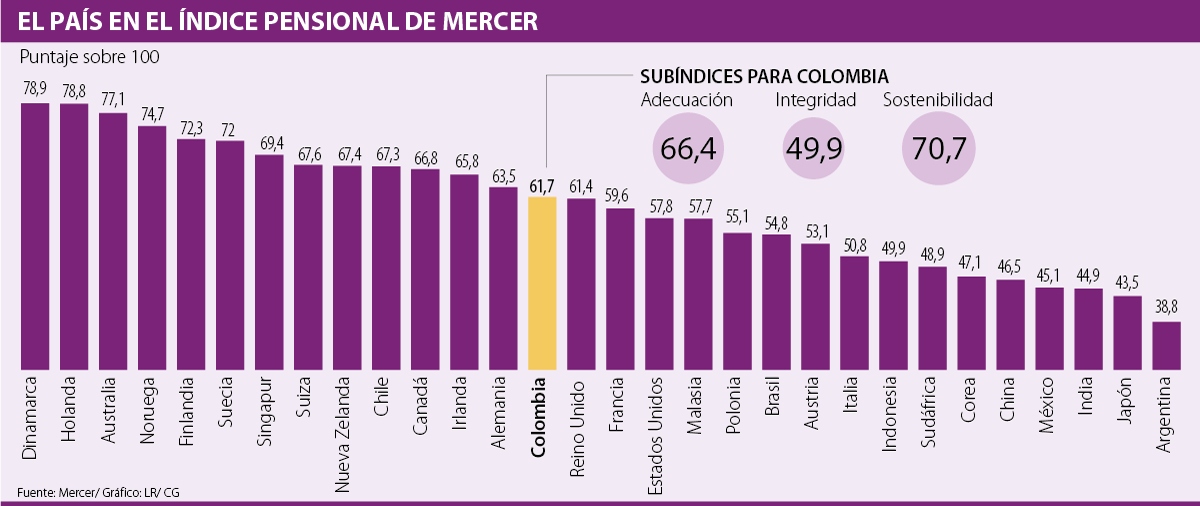Colombia obtuvo una puntuación de 61,7 sobre 100 en una evaluación que tiene en cuenta tres aspectos: la adecuación del sistema, su integridad y su sostenibilidad. En total, Mercer midió 40 aspectos entre los que incluyó desde el diseño del sistema, el apoyo a los impuestos, la cobertura de la población y hasta los costos y la regulación del aparato pensional.
