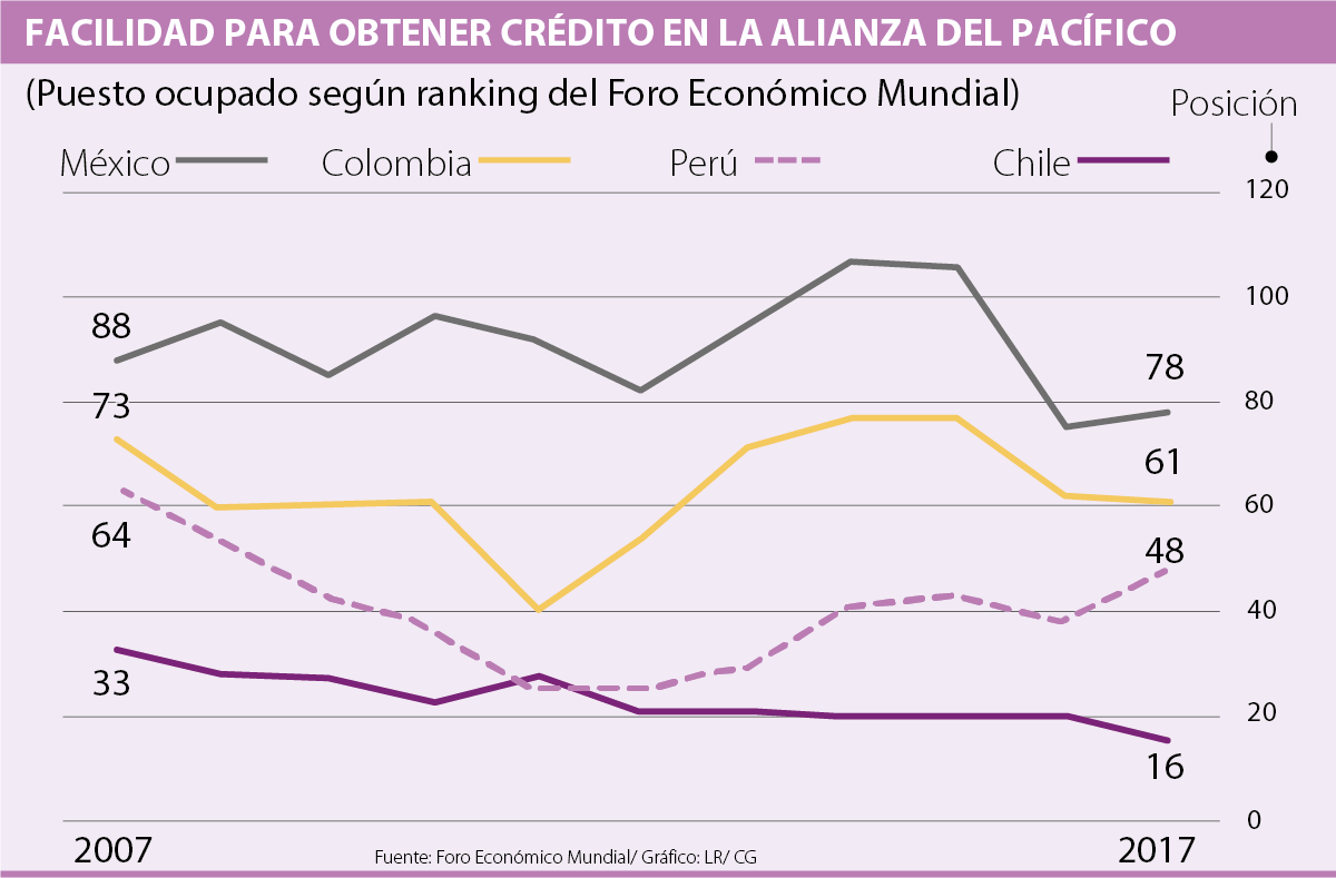 Cuando el Foro Económico Mundial presentó los resultados del índice de competitividad 2016-2017, se pudo ver que Colombia no repuntó en la calificación general pues pasó del puesto 61 al 66. Pero hubo otro ranking dentro del mismo índice en el que se ven entre 120 territorios los lugares donde es más fácil pedir un crédito como persona natural. En ese listado, entre la Alianza del Pacífico, Chile está en el puesto 16; Perú, en el 48; Colombia, en el 61; y México, en el 78.