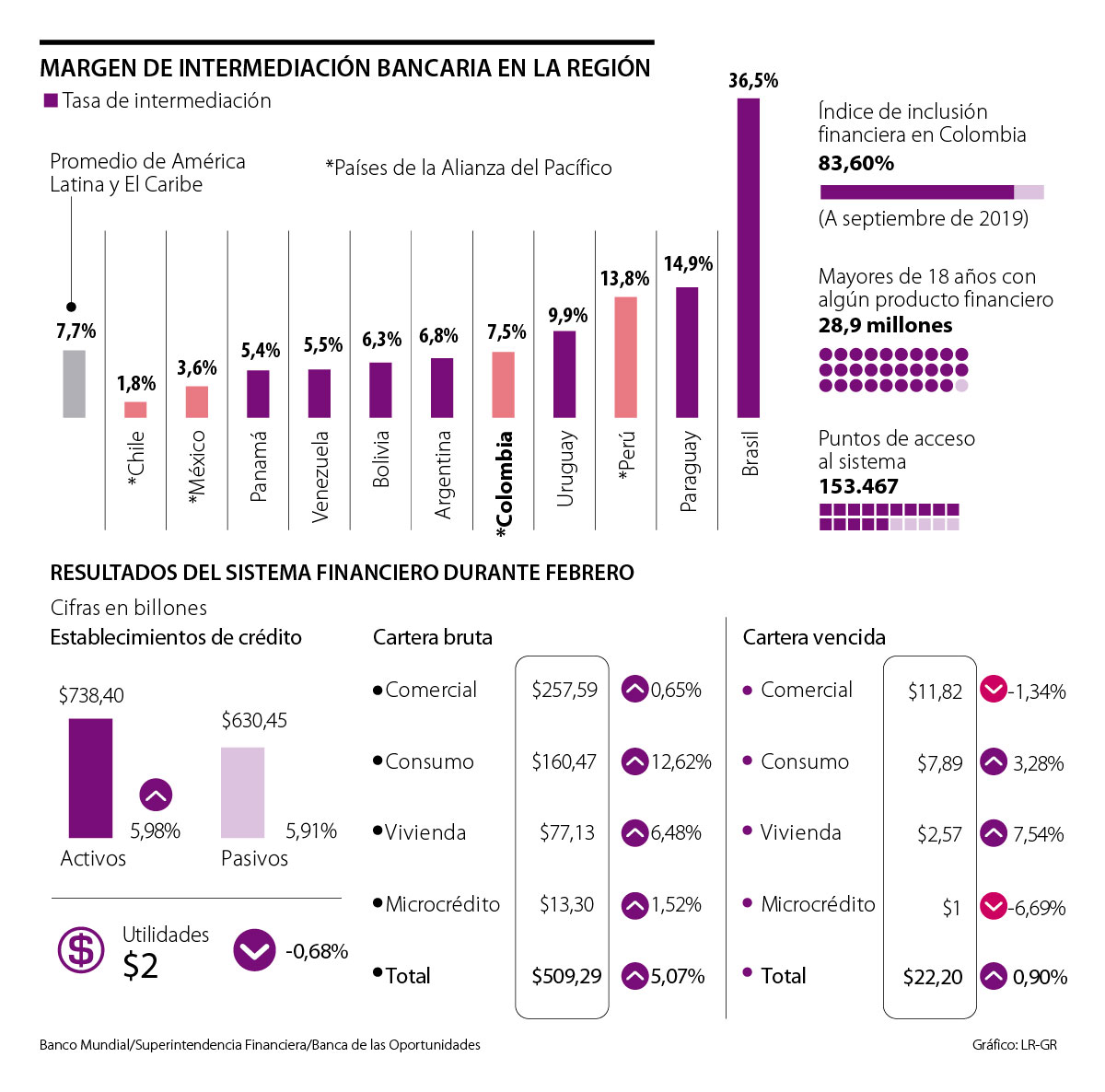 Las cifras del Banco Mundial muestran que el margen en Colombia es de 7,5% y el promedio de Latinoamérica es de 7,7%, cifras que subieron frente al anterior informe (2018), cuando el índice de Colombia fue de 6,8% y el de la región fue de 7,5%.