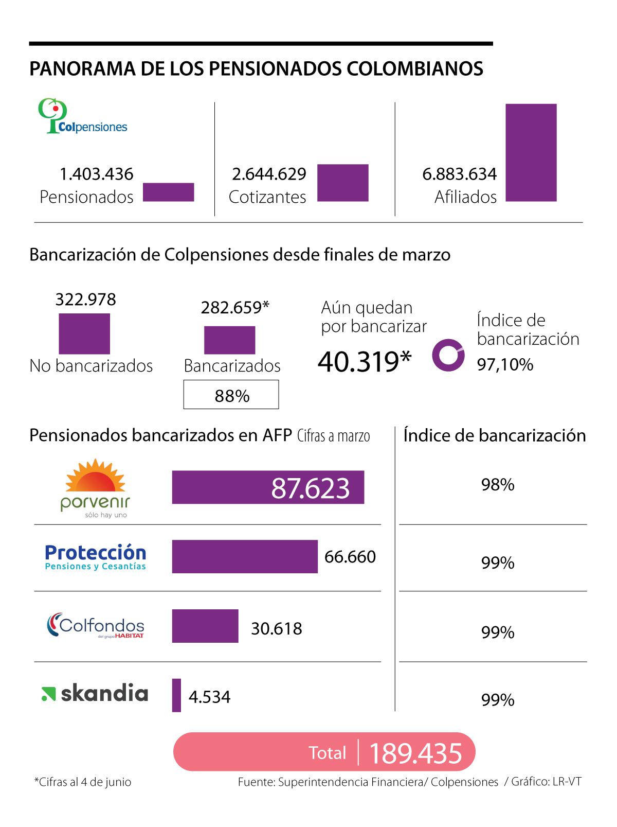 A marzo, Porvenir registra 87.623 jubilados, de los cuales hoy 98% son bancarizados; Protección cuenta con 66.660 pensionados, con un índice de bancarización de 99%, y Colfondos, con 30.818 pensionados, presenta una bancarización de 99%; así como Skandia, compañía responsable de la pensión de 4.534 personas.