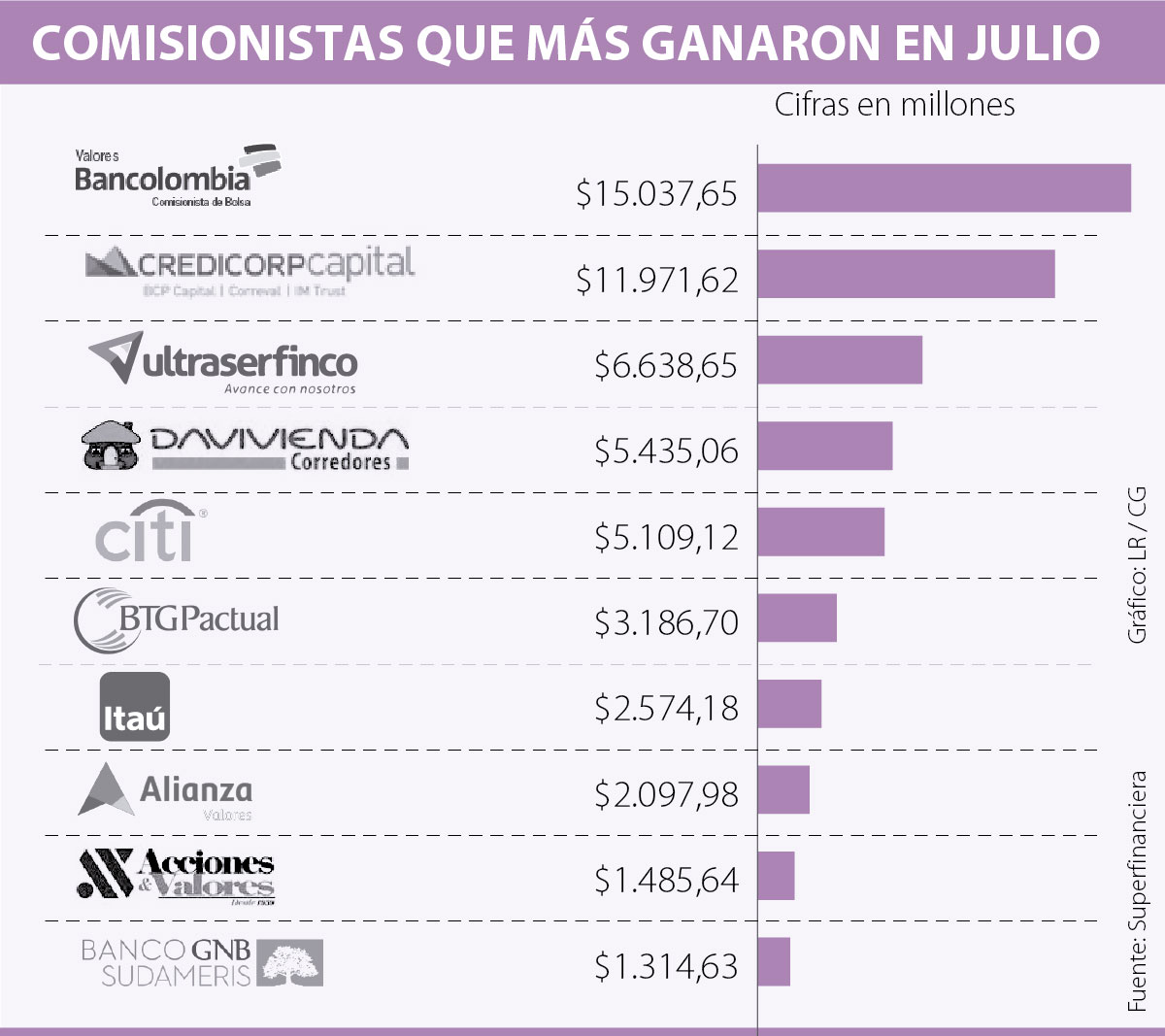 Una vez más, encabezaron la lista de las ganancias las mismas cuatro comisionistas. En primer lugar, se encuentra Valores Bancolombia, que reportó utilidades por $15.037,65 millones, con lo cual aumentó $2.389 millones frente al mes de junio. Detrás, se encuentra Credicorp Capital, la compañía que en el mes anterior había registrado $11.383,76 millones y en esta oportunidad alcanzó $11.971,62 millones.