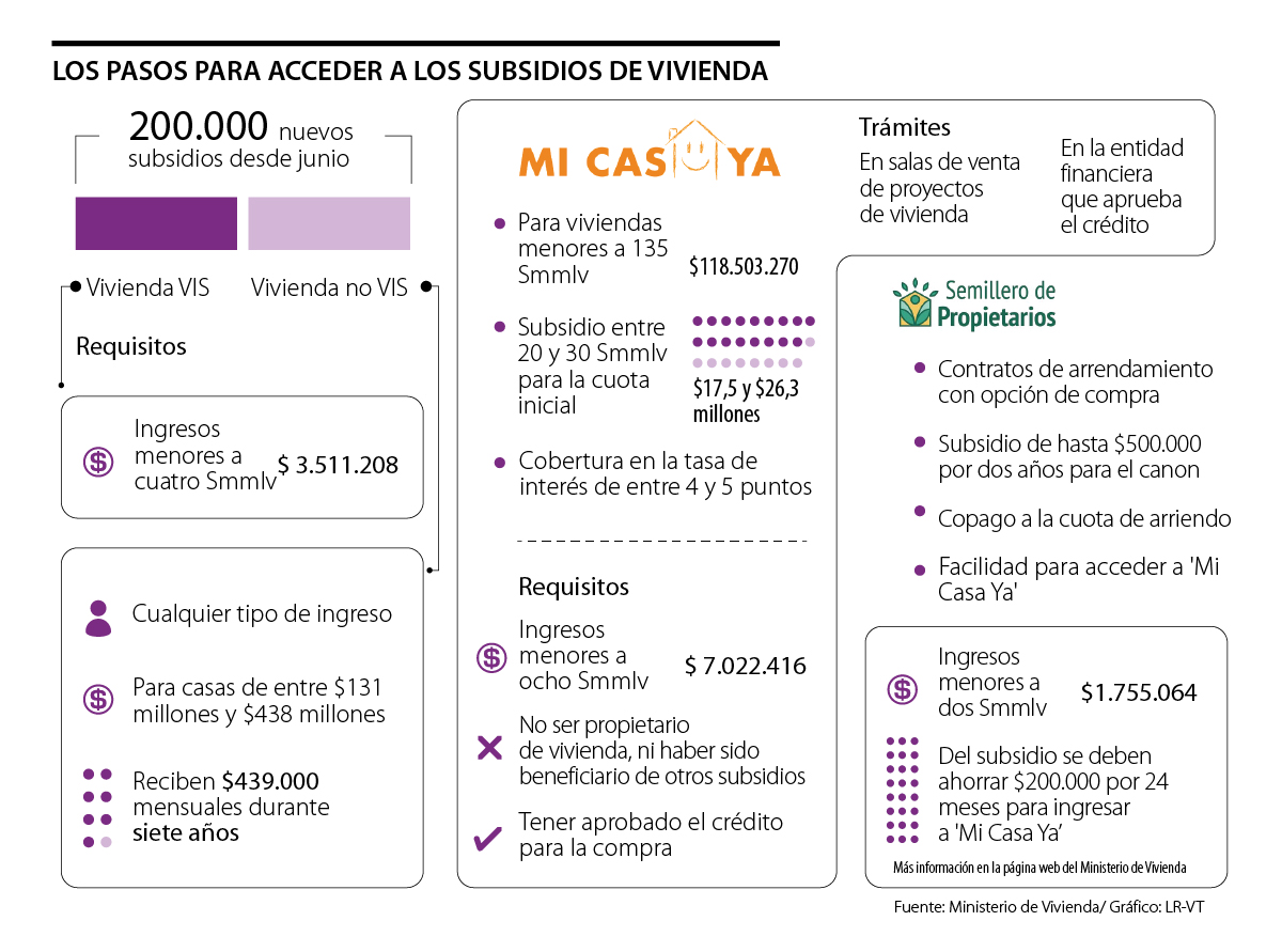 Los subsidios para VIS son para personas con ingresos menores a $3,51 millones. Las ayudas para No VIS son de $439.000 mensuales durante los primeros siete años del crédito ($36,9 millones en total). Para ambos casos, los auxilios solo son para compra de vivienda nueva y, en la mayoría de los casos, se debe contar con la cuota inicial de la propiedad, que representa 30% del valor total de la vivienda.