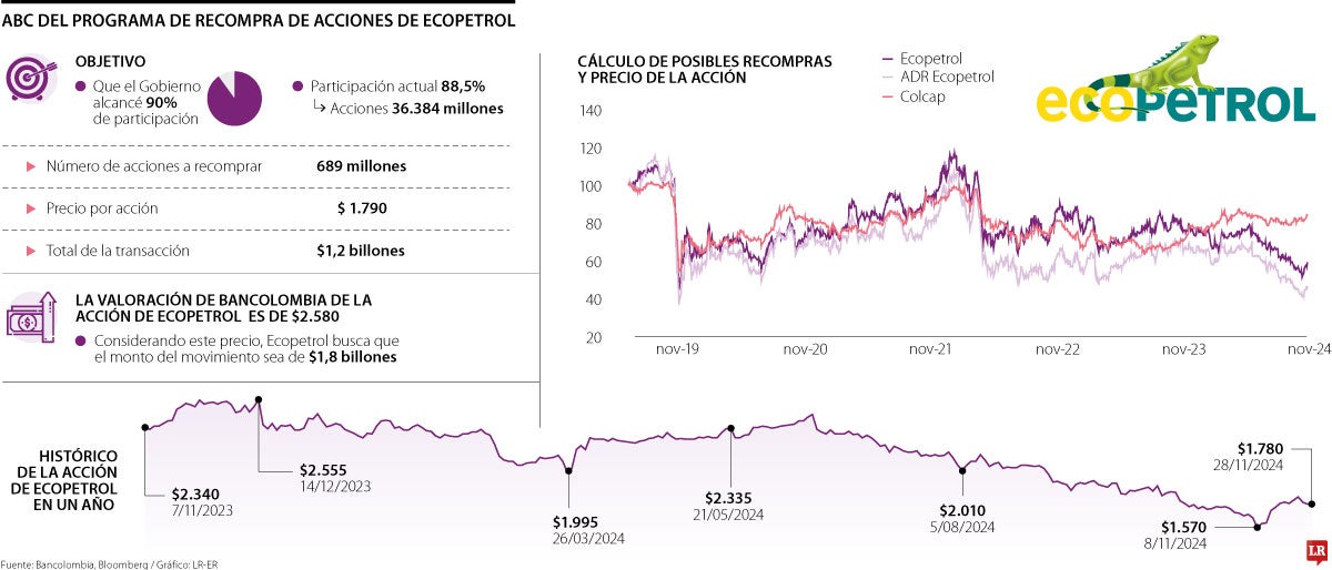 Para lograr el objetivo de una participación de 90% del Gobierno en la petrolera, las acciones a recomprar estarían limitadas a un máximo de 689 millones. A los precios actuales de $1.790 por acción, esto equivaldría a $1,2 billones, aproximadamente. Sin embargo, dado que Bancolombia valora el título en $2.580, el monto ascendería a aproximadamente $1,8 billones.