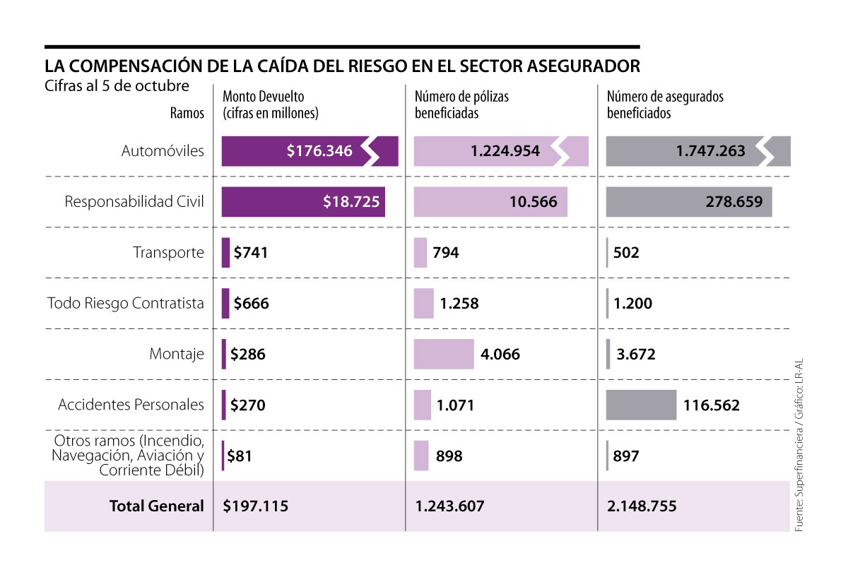 Como consecuencia de la pandemia y de las decisiones que se tomaron para contener el virus, el riesgo de algunos productos del sector asegurador disminuyó. Por ello, al 5 de octubre, las compañías de seguros devolvieron $197.115 millones a 2,15 millones de asegurados, ya que el Código de Comercio establece que cuando baja el riesgo, el asegurador deberá reducir el valor de la prima en proporción de dicha disminución.