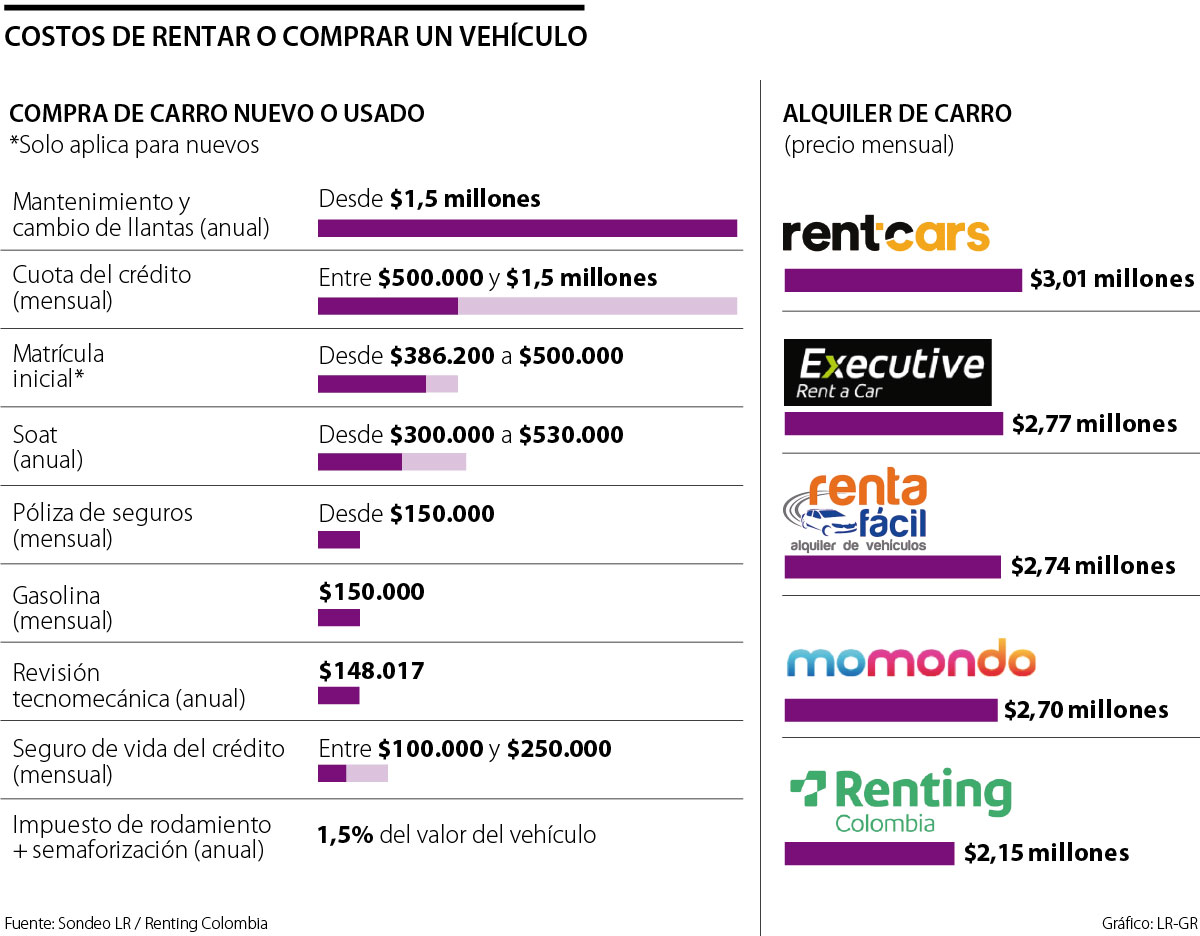 En promedio, tener un vehículo podría costarle $13 millones anuales, dependiendo tanto del uso, como del tipo de carro que adquiere. Sin embargo, establecimientos como Renting o Localiza han implementado un modelo de alquiler mensual, por el cual se paga una tarifa, desde $1,11 millones en caso de requerir carros por un valor de entre $52,6 millones y $60 millones, y bajo la cual se libra de trámites de arrendamiento, el mantenimiento del vehículo, el pago de impuestos y su lavado.