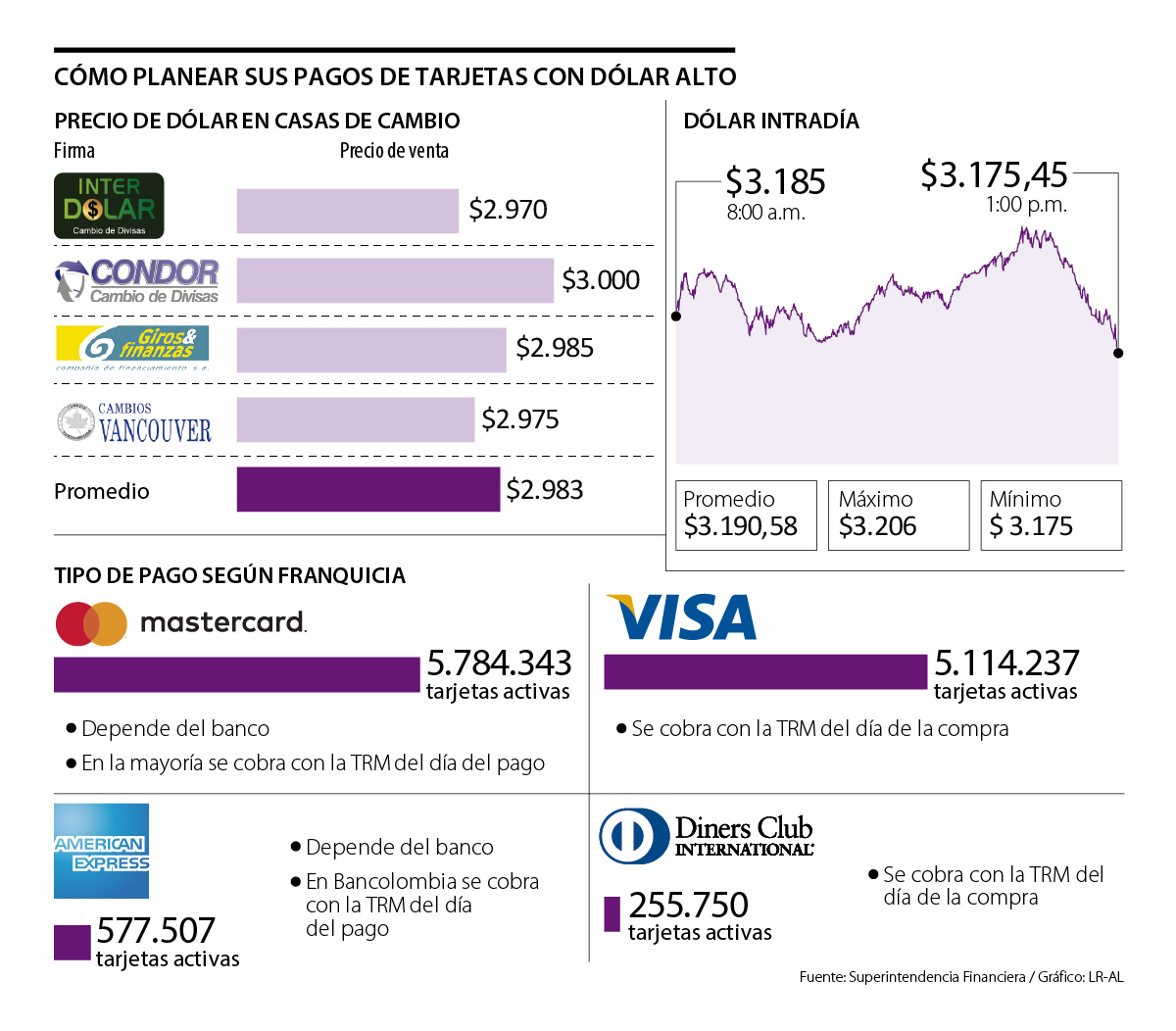 En el caso de Visa, todas sus tarjetas liquidan las compras con la TRM del día en que se hace la transacción. La firma cuenta con una herramienta web con la que el consumidor puede calcular el cobro de conversión a su moneda más la comisión bancaria de la transacción, un factor que suele estar en un promedio de 1%, aunque hay entidades no la cobran a algunos clientes.