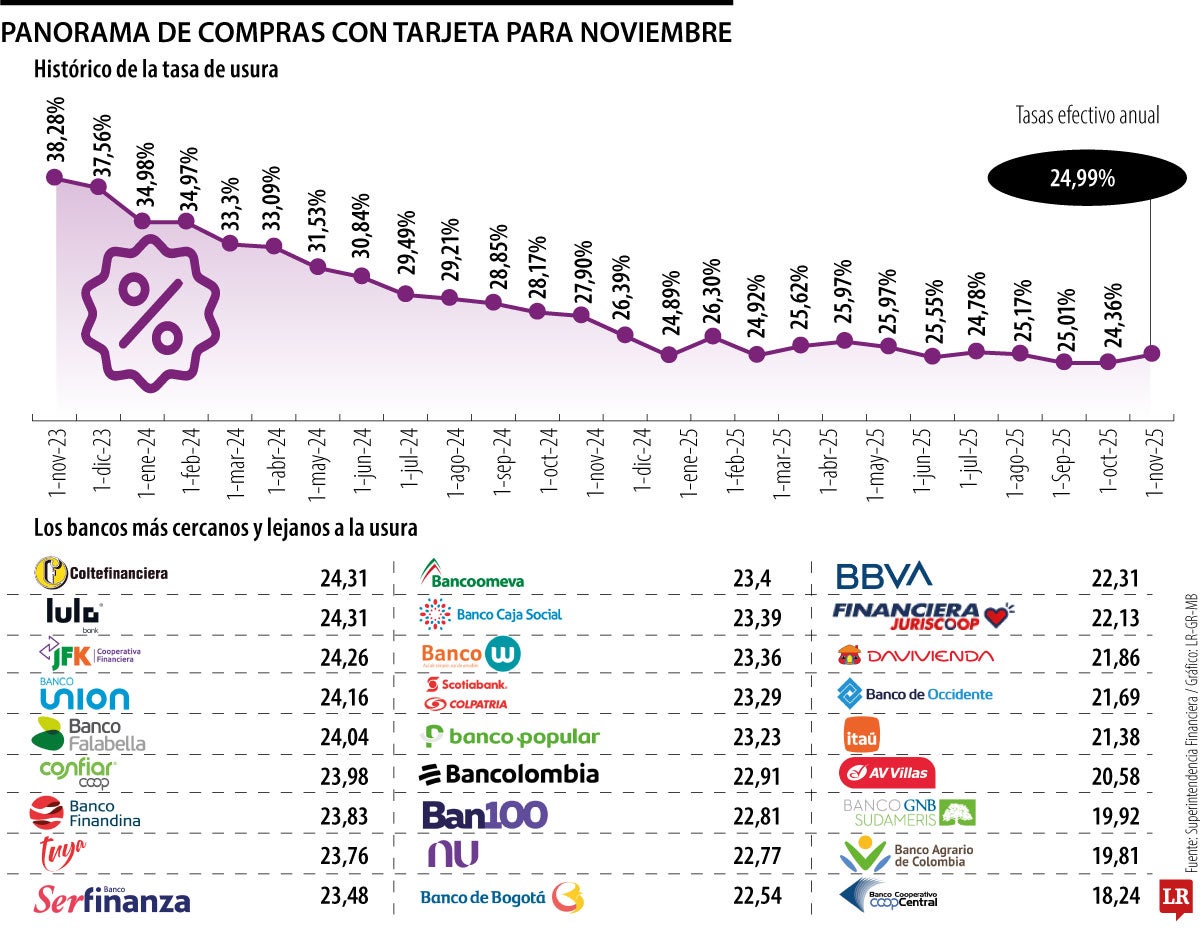 Luego de que el Emisor dejara inalterados los tipos de interés, la Superintendencia Financiera reveló la tasa de usura para el undécimo mes del año, que es el techo de interés que un banco puede cobrar por un préstamo. Ese tope quedó en 24,99% E.A. para noviembre, un alza de 0,63 puntos porcentuales frente a la cifra del mes pasado de 24,36%.