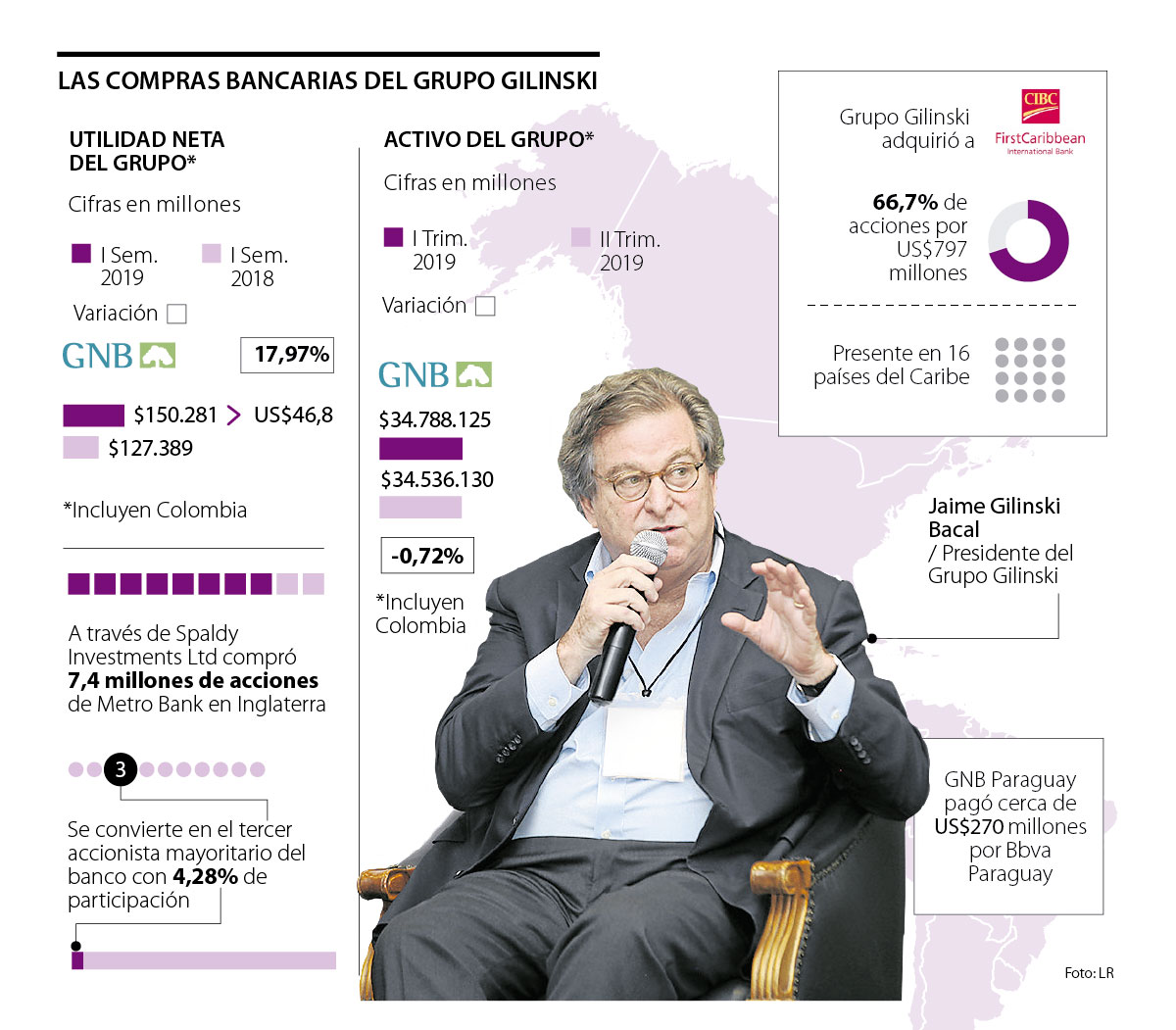 En la primera semana de noviembre, el holding comandando por Jaime Gilinski Bacal confirmó que los activos de su negocio financiero iba a llegar a US$26.000 millones una vez las autoridades regulatorias den el visto bueno de la compra de 66,73% de las acciones del caribeño FirstCaribbean Bank (Ficb), por las que acordó pagar US$797 millones al Canadian Imperial Bank of Commerce (Cibc); sin embargo, la cifra ascenderá dado que en Londres acordó hacerse con 4,28% de participación en el minorista Metro Bank y se convirtió en su mayor accionista.