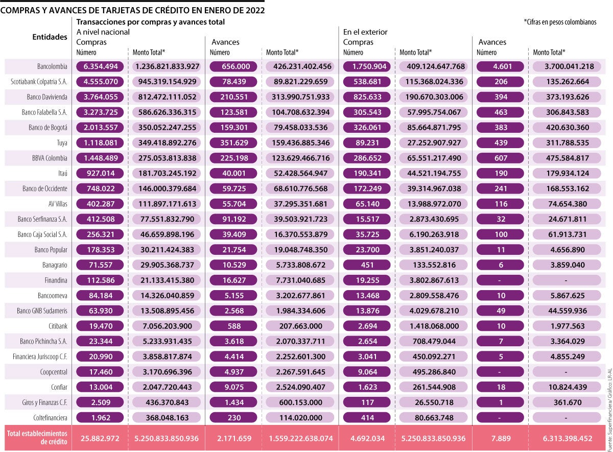 Respecto a avances realizados con este tipo de plástico, el número global está liderado nuevamente por Bancolombia, con $426.231 millones y 656.000 movimientos. A este establecimiento le siguen Davivienda, con $313.990 millones y 210.551 movimientos; Tuya, con $159.436 millones y 351.629 movimientos; Bbva, con $123.629 millones y 225.198 movimientos; y Banco Falabella, con $104.708 millones y 123.581 movimientos.