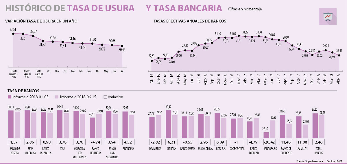 Teniendo en cuenta el tope que certificó la Superfinanciera de tasa de usura, al 15 de junio de este año los bancos que tienen una tasa más cercana a ese techo son el Banco de Bogotá y Bbva Colombia, ya que manejan una tasa de interés de 29,85% y 29,54%; respectivamente. Siguiendo esta lista se encuentran el Banco Falabella, que tiene una tasa para tarjetas de crédito de 29,35%; Itaú 29,27%; Colpatria 29,05%; Pichincha con un cobro efectivo anual de 28,98%; Banco GNB Sudameris con 28,97%; Finandina 28,59% y el Banco Davivienda con un cobro de 28,57%. Sobre las tasas más bajas, éstas siguen lideradas por AV Villas (25,02%) y Occidente (25,32%).