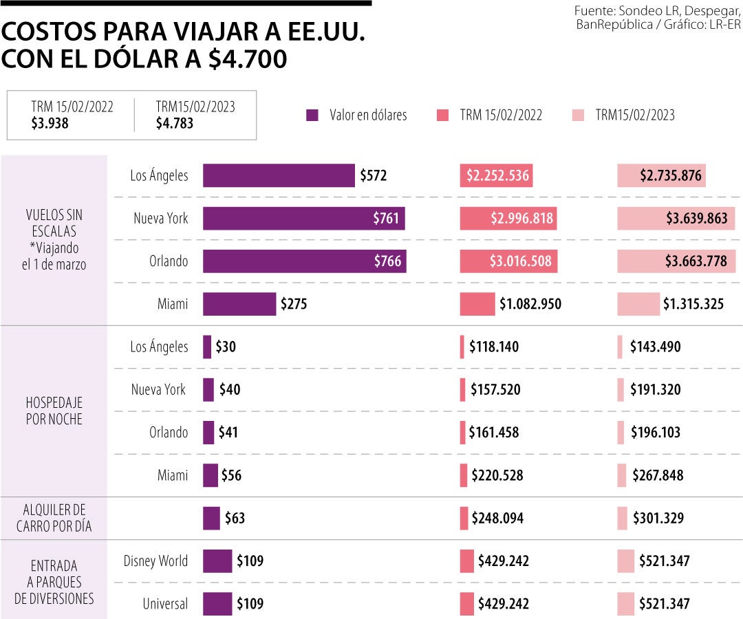 En caso de volar a un destino como Los Ángeles, saliendo el primero de marzo, podrá encontrar vuelos a US$572, según un sondeo realizado por LR en la plataforma Despegar.com. Si se revisa el equivalente con la TRM del 15 de febrero de 2021 el monto a pagar serían $2,2 millones, pero si se hace el cambio con la tasa de hoy ($4.783) el precio sube a $2,7 millones (ver gráfico).